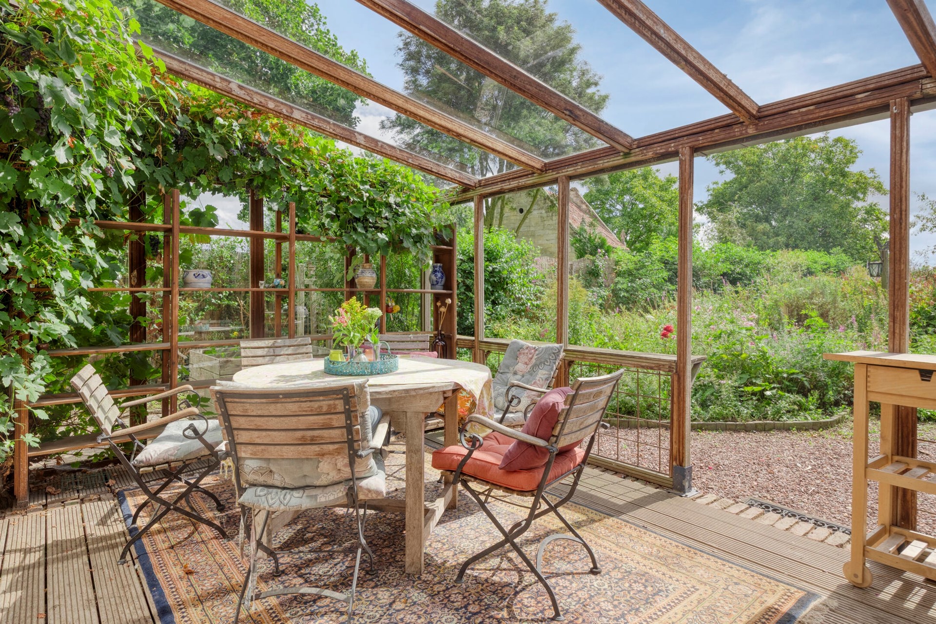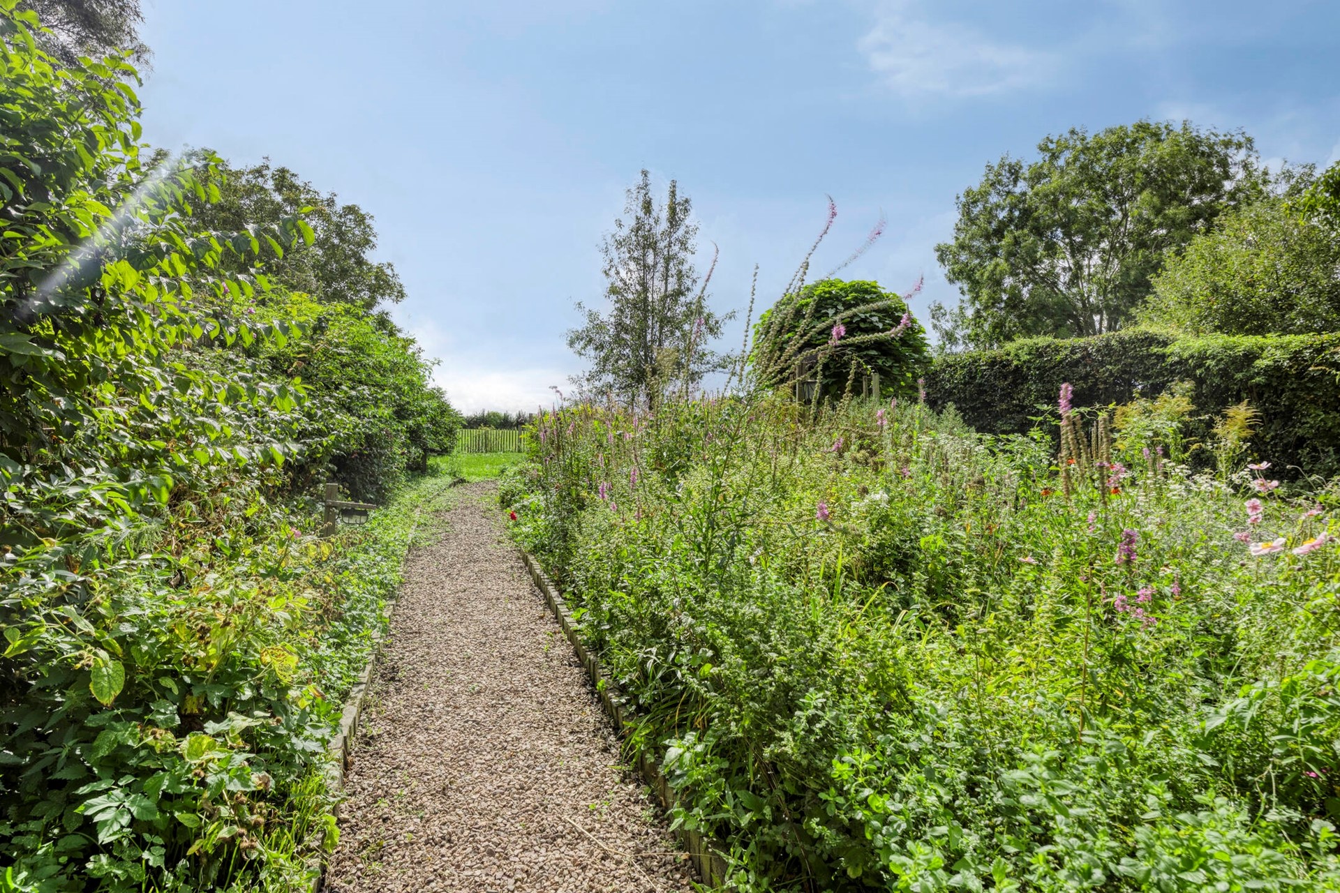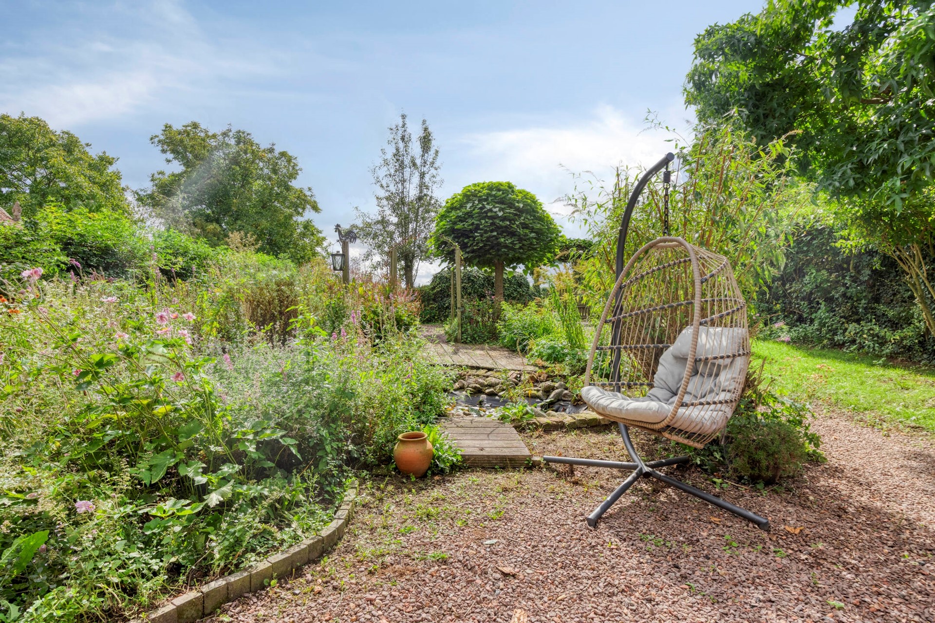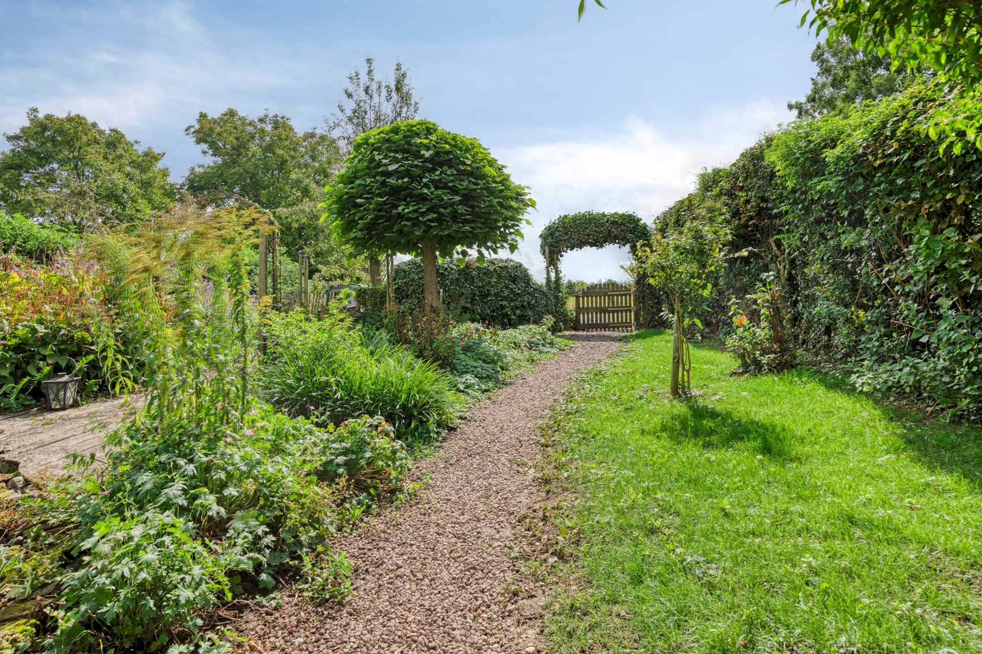 De tuin rondom de woning is rijk aan bloemen, vogels en groen. Meerdere terrassen, een grote kas en een vijvertje geven het geheel een speelse en romantische uitstraling. De schuifpui naar de overkapping maakt het mogelijk om vrijwel het hele jaar buiten te genieten. Op eigen terrein is parkeergelegenheid voor drie auto’s.