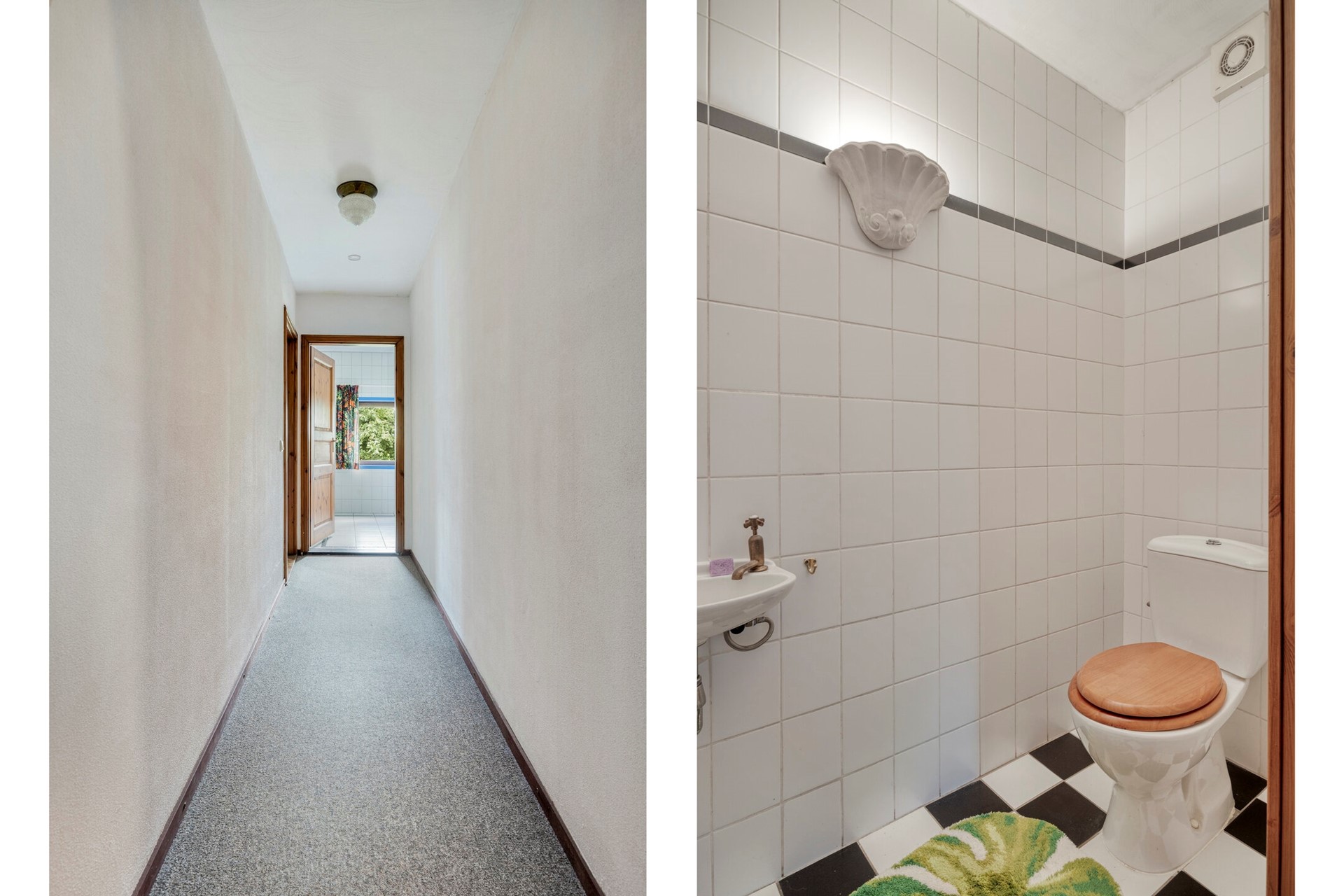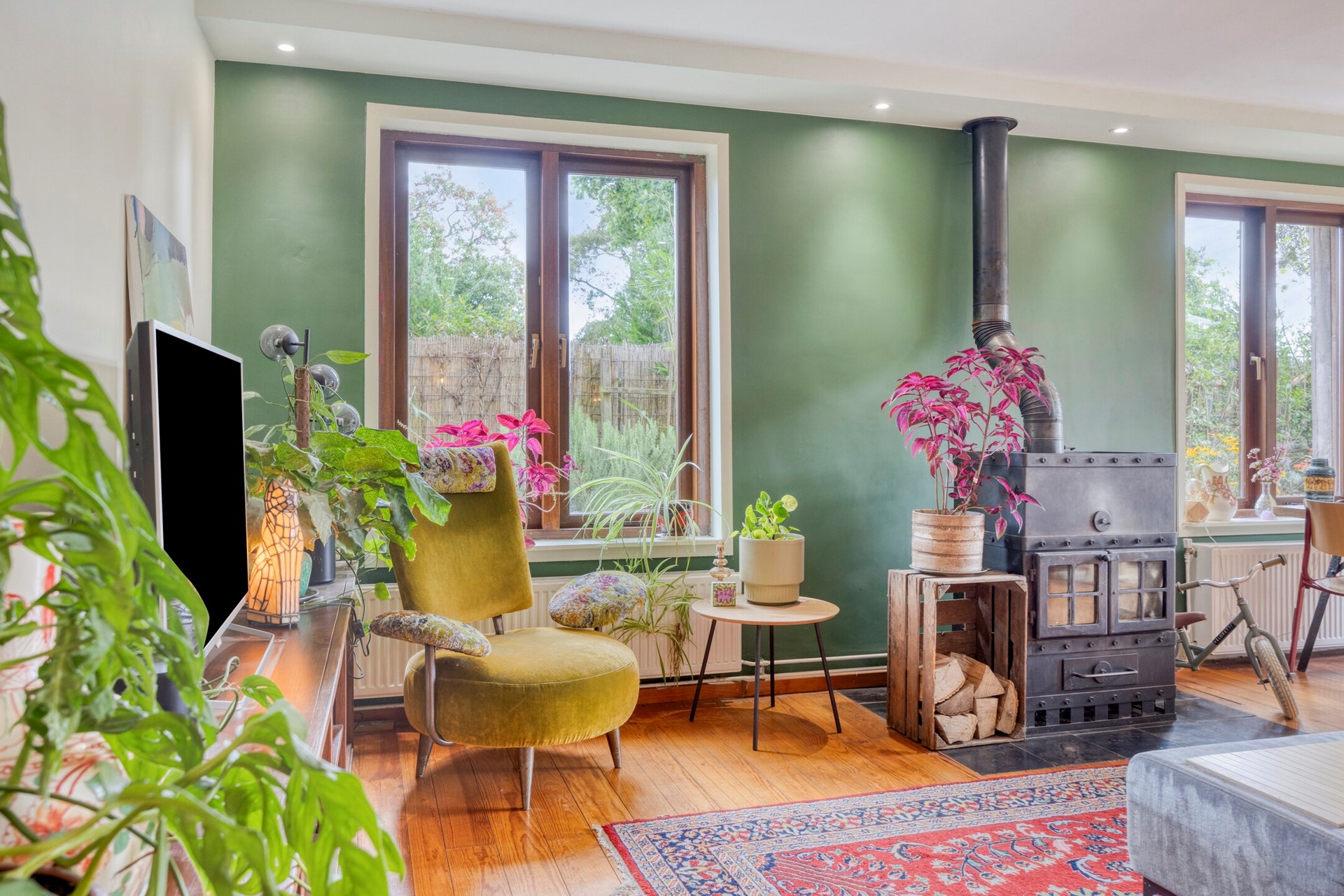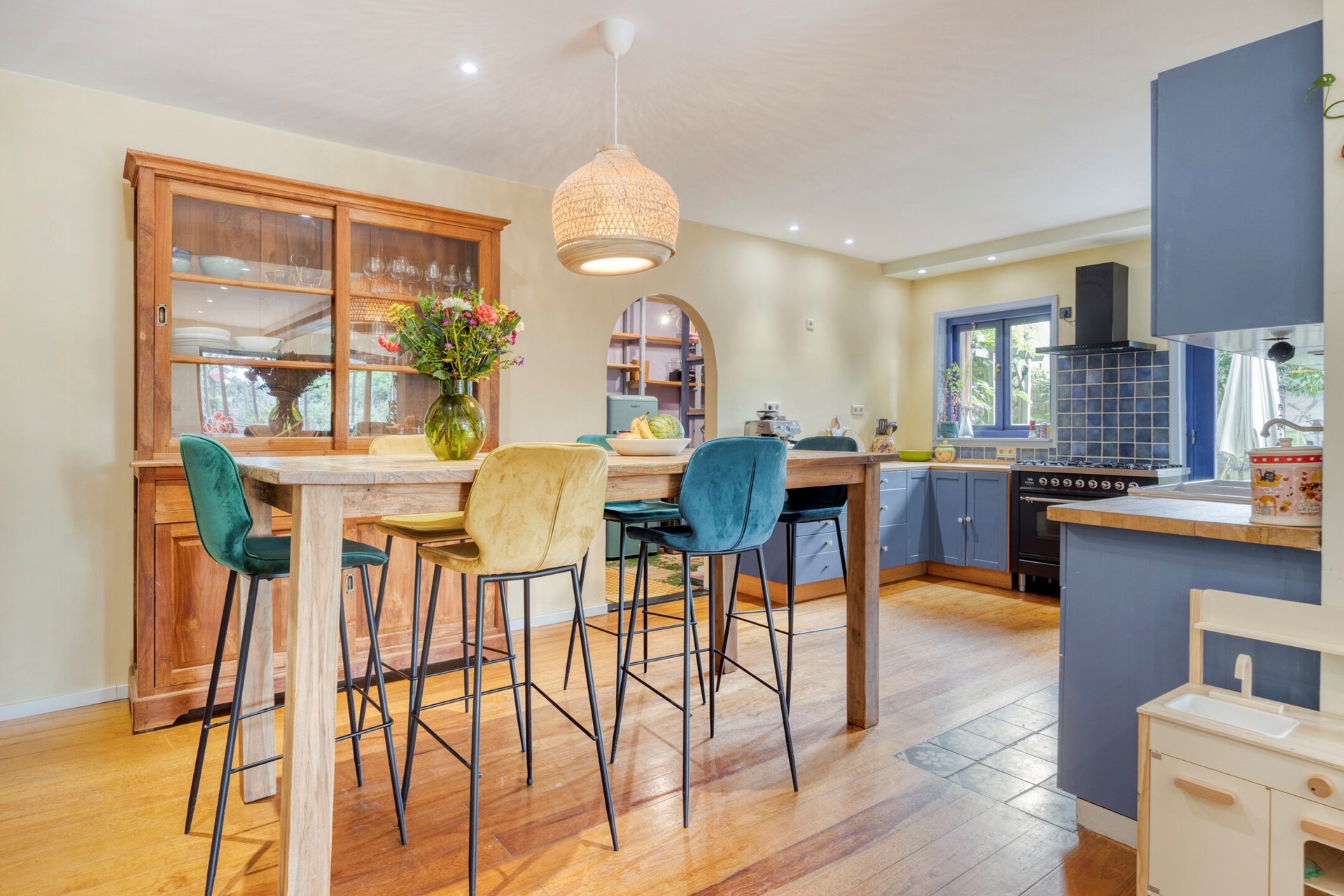 De entree is royaal en betegeld, met plek voor jassen en schoenen. Vanuit de hal bereik je de sfeervolle woonkamer waar houten vloeren, inbouwspotjes en een houtkachel zorgen voor warmte en karakter. De brede schuifpui geeft toegang tot de romantische terrasoverkapping en de tuin. Hier vloeien binnen en buiten naadloos in elkaar over.