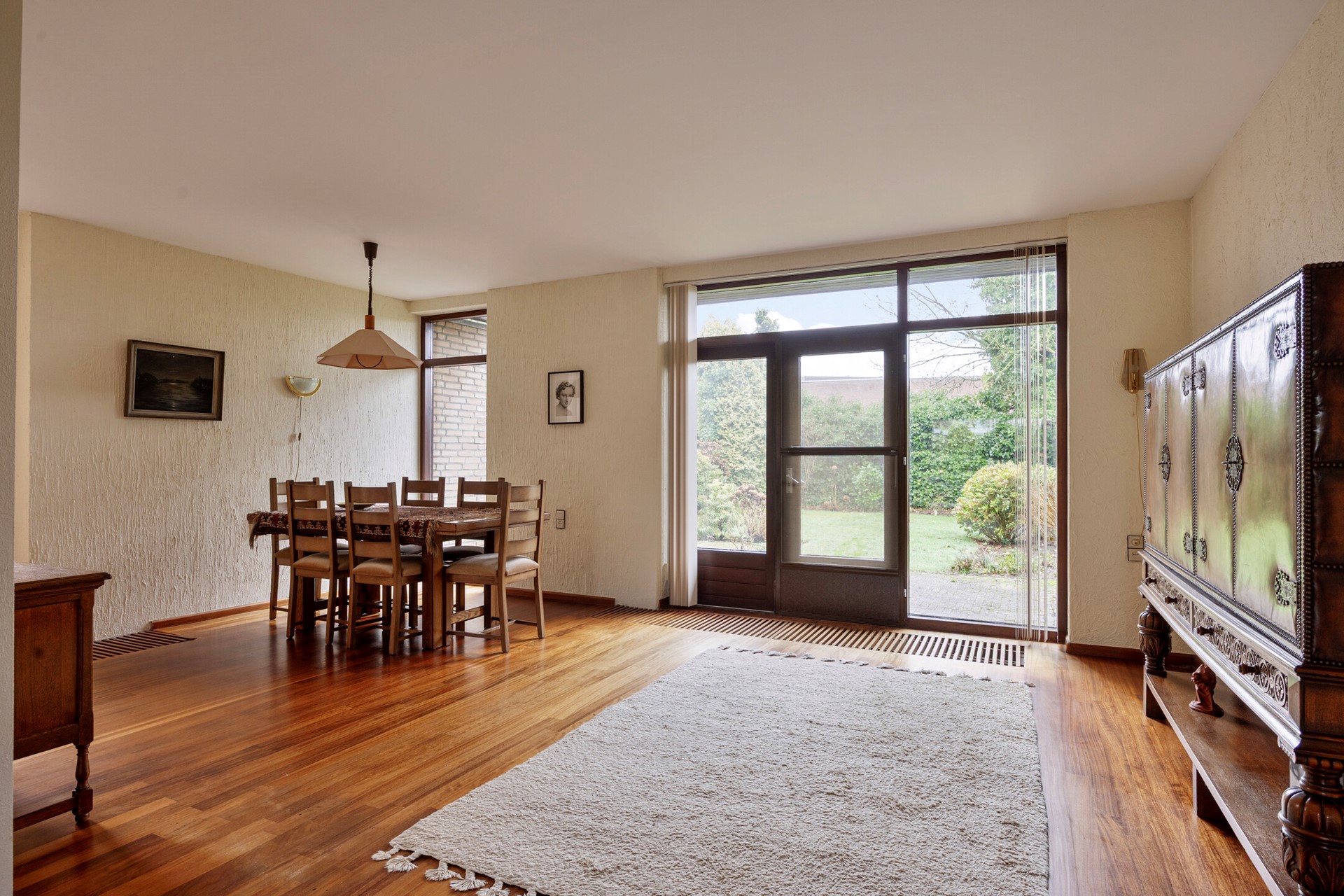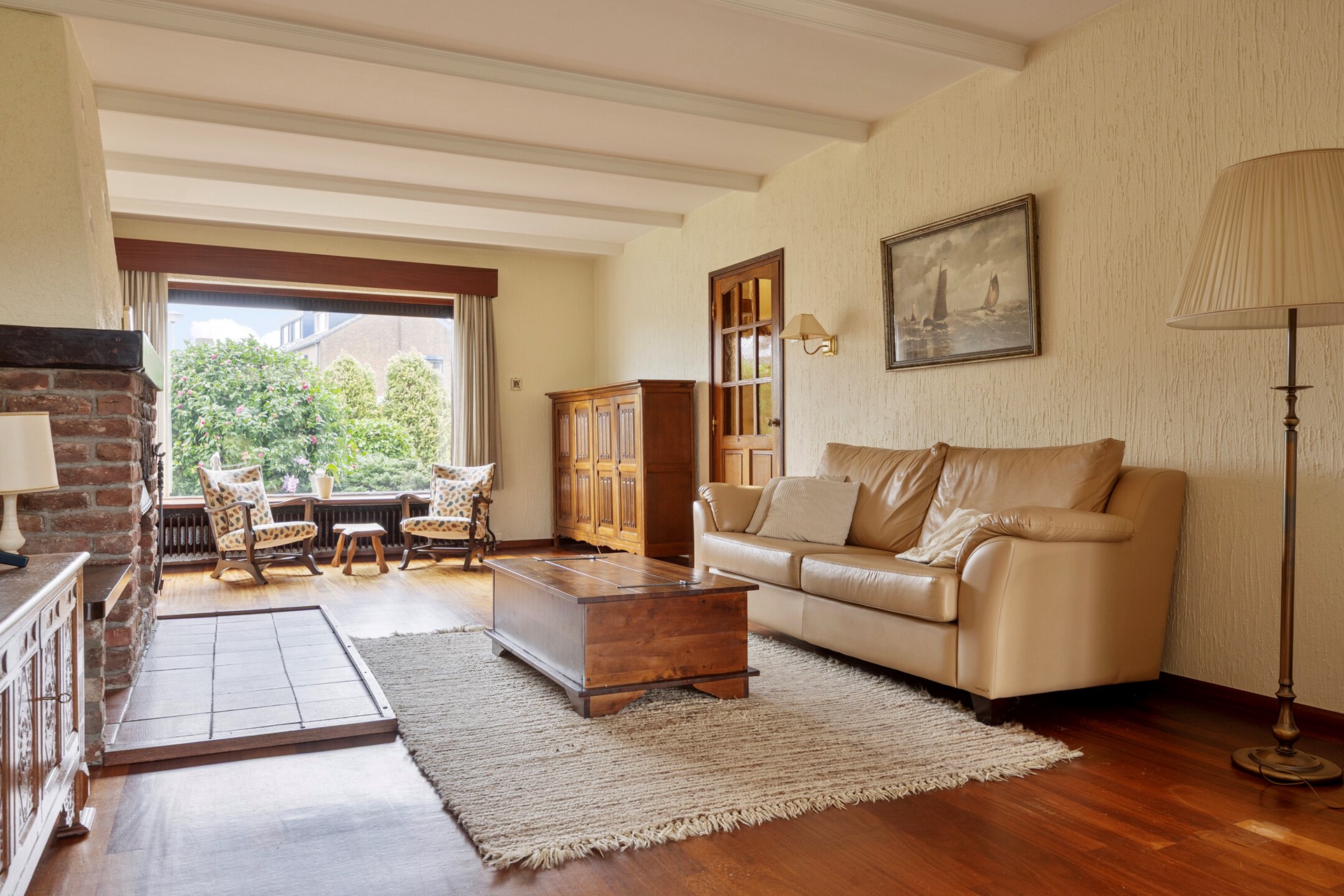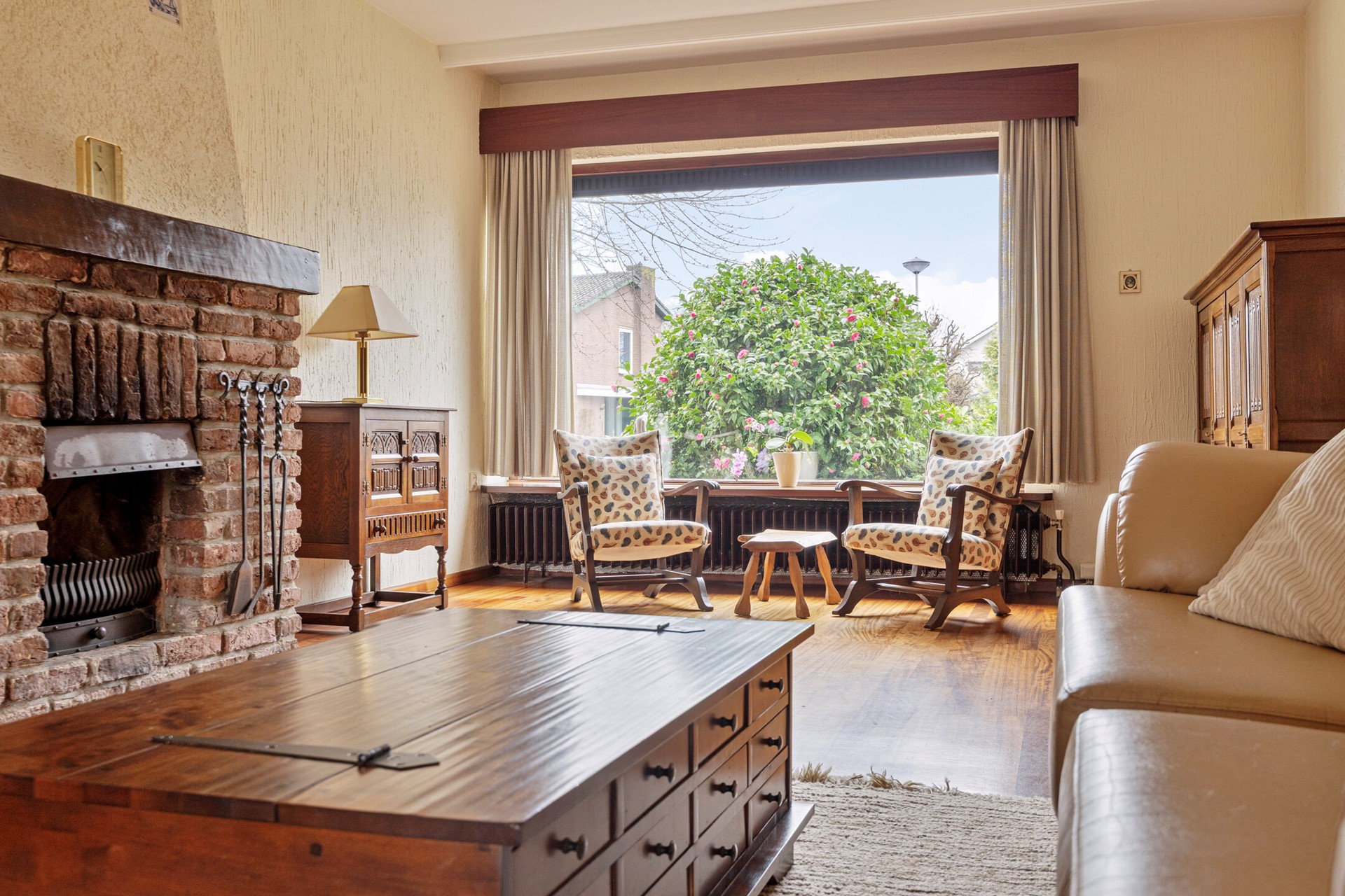 Via de entree met toiletruimte en trapopgang kom je binnen in de woning. De woonkamer (circa 55 m²) is uitgevoerd in een ruime L-vorm en dankzij de uitbouw aan de achterzijde verrassend royaal. De houten vloer, de haardpartij en de grote raampartijen zorgen voor een warme basis met veel lichtinval.