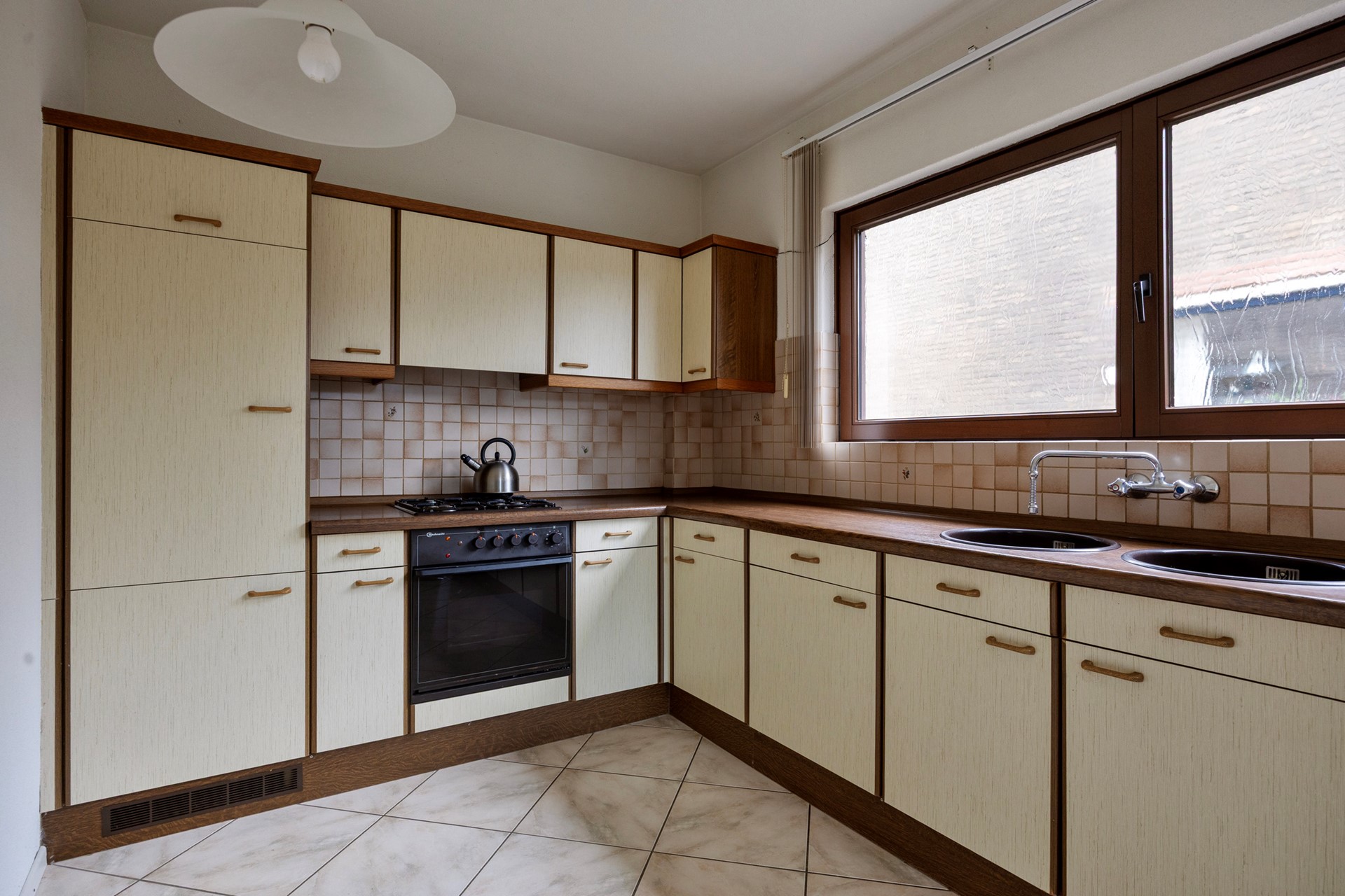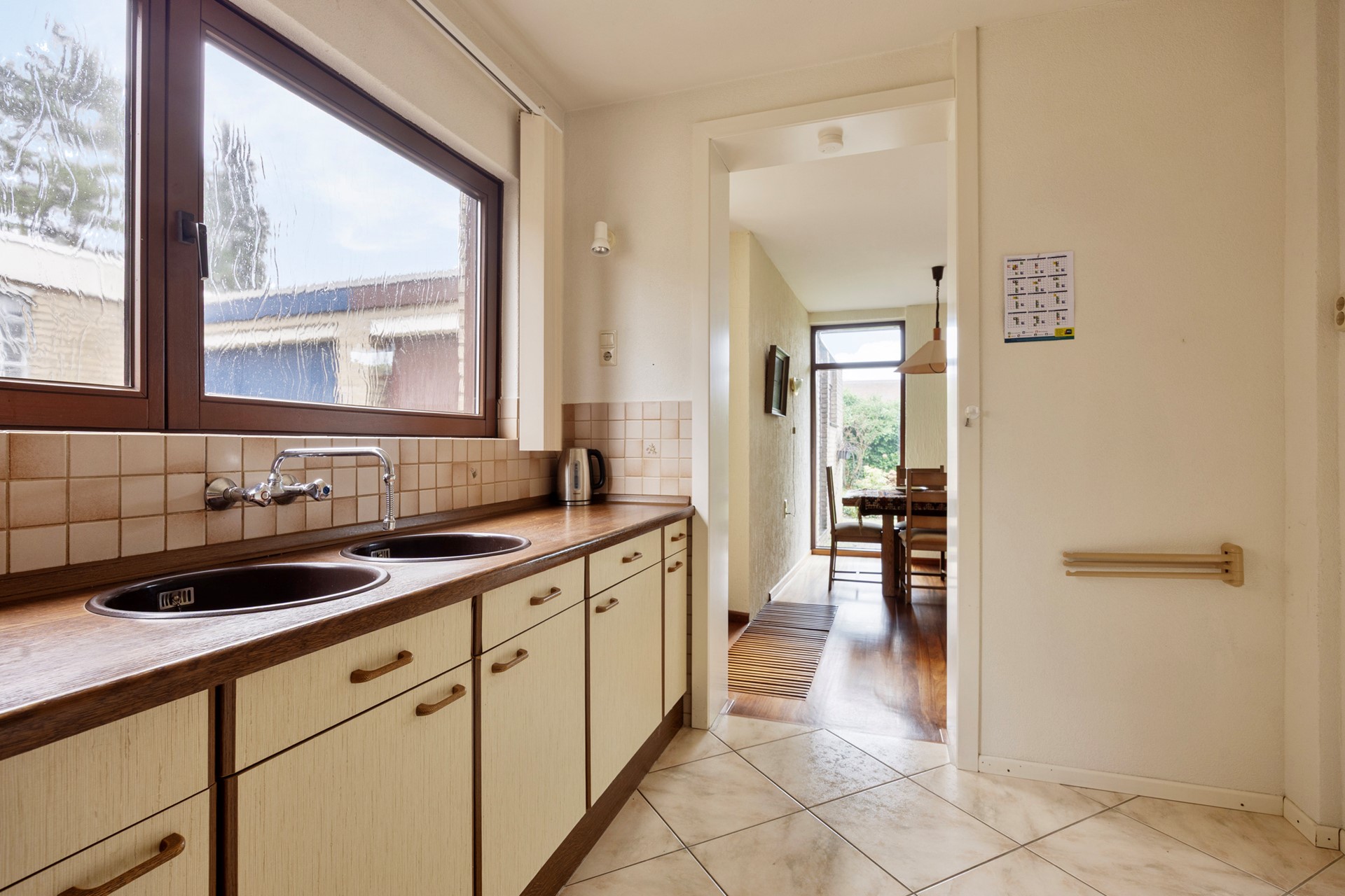 De keuken ligt naast de woonkamer. Er zijn mooie mogelijkheden om keuken en woonkamer meer met elkaar te verbinden en zo een eigentijdse leefruimte te realiseren.