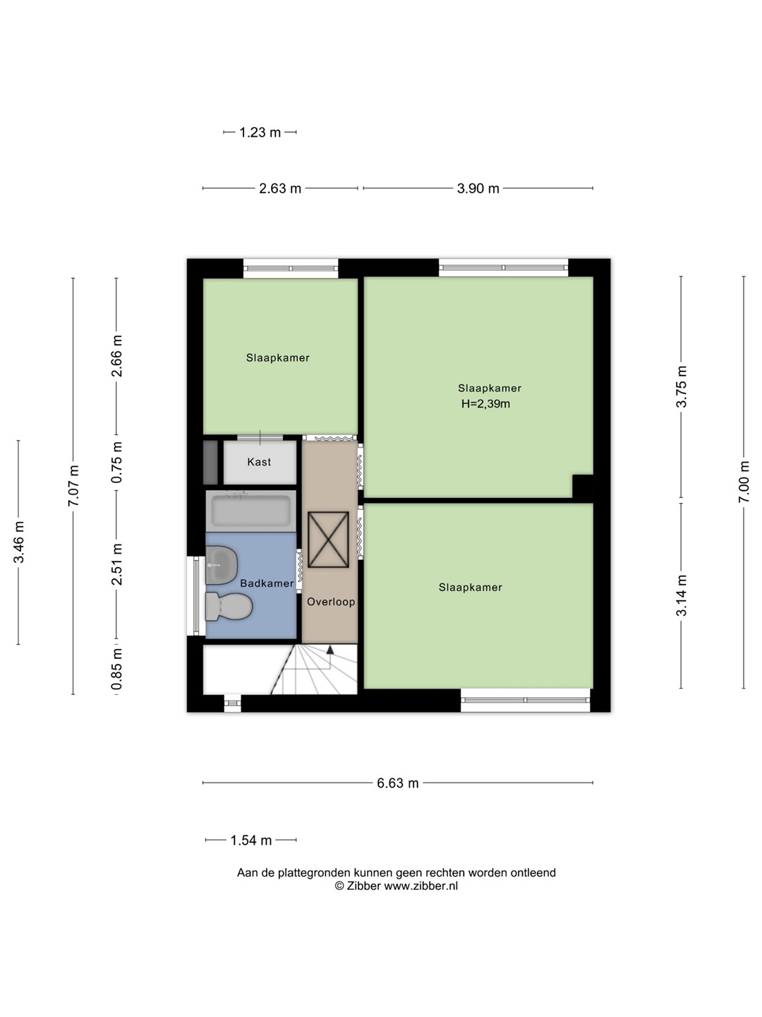 Op de eerste verdieping bevinden zich drie slaapkamers van ruim 7 m², 12 m² en 14 m². Alle kamers zijn hiermee prettig van formaat. Ideaal voor een gezin of voor wie een extra werk- of hobbykamer wenst.