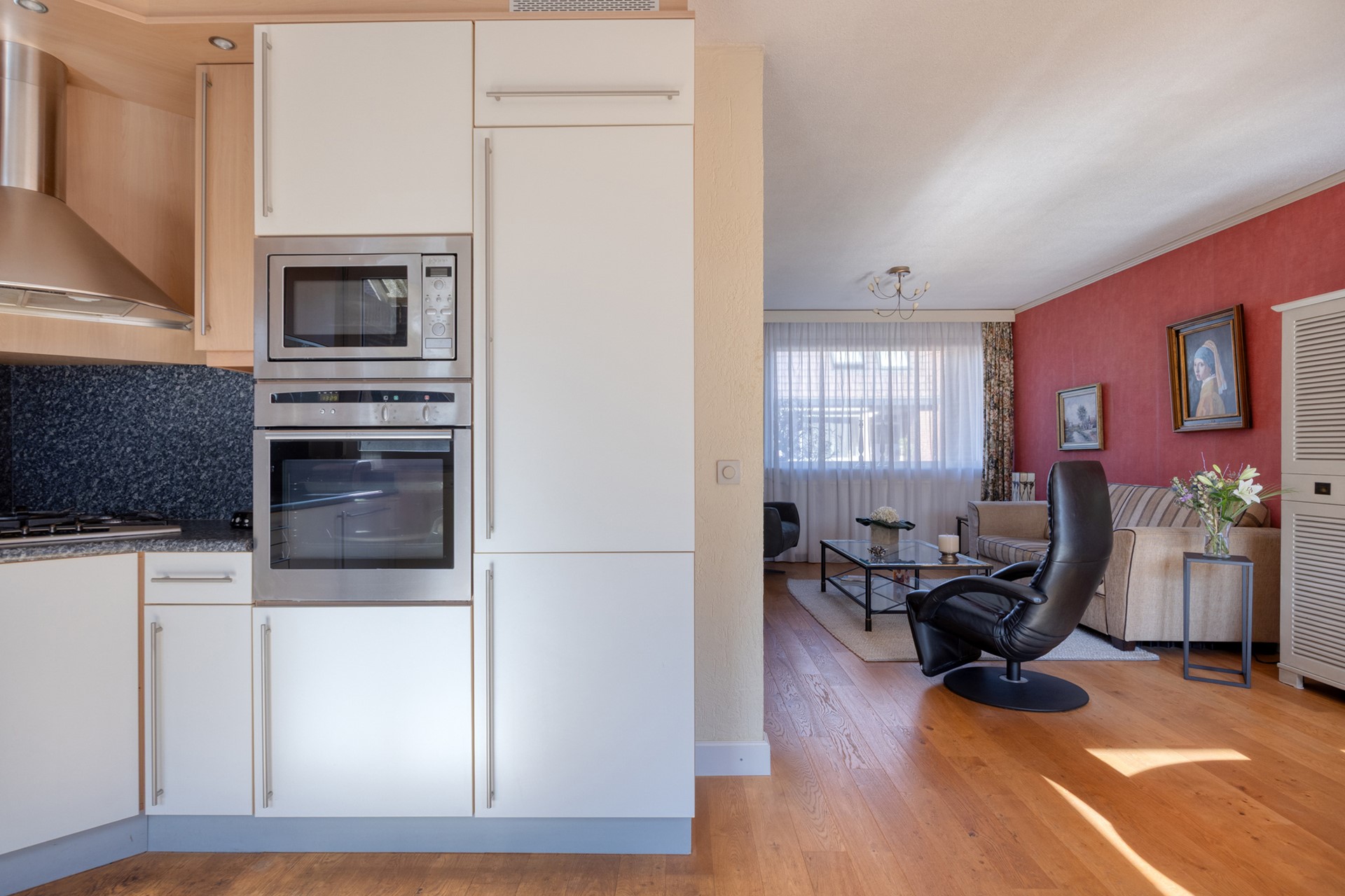 Aansluitend ligt de keuken, uitgevoerd in een praktische hoekopstelling met een neutrale kleurstelling en bovenkastjes. De keuken is compleet ingericht met onder meer een oven, magnetron, gaskookplaat, afzuigunit, vaatwasser en een koel-/vriescombinatie. De vaatwasser en koel-/vriescombinatie zijn minder dan één jaar oud. Via de achterdeur, onder een praktische luifel, is ook vanuit de keuken de tuin bereikbaar.