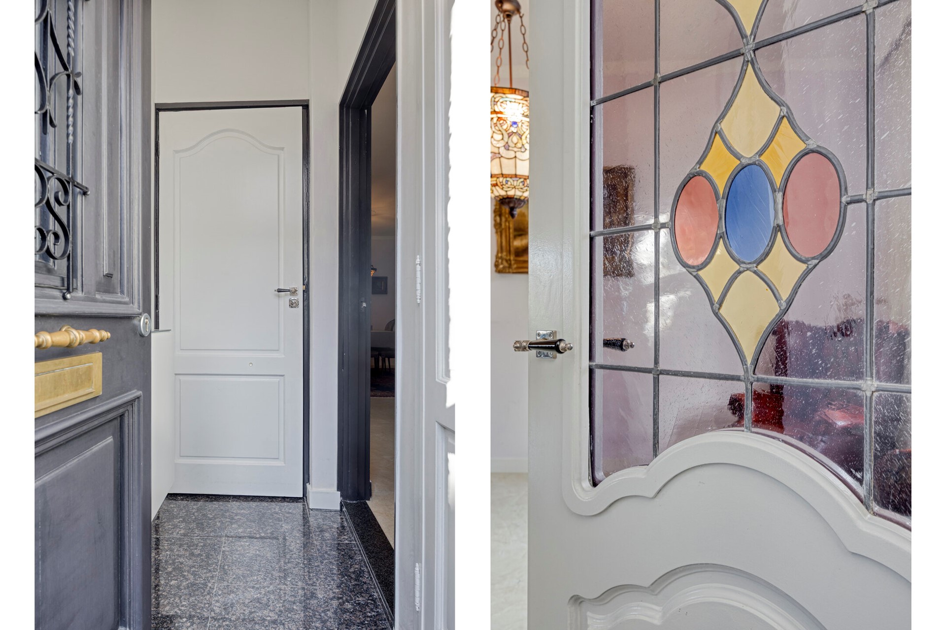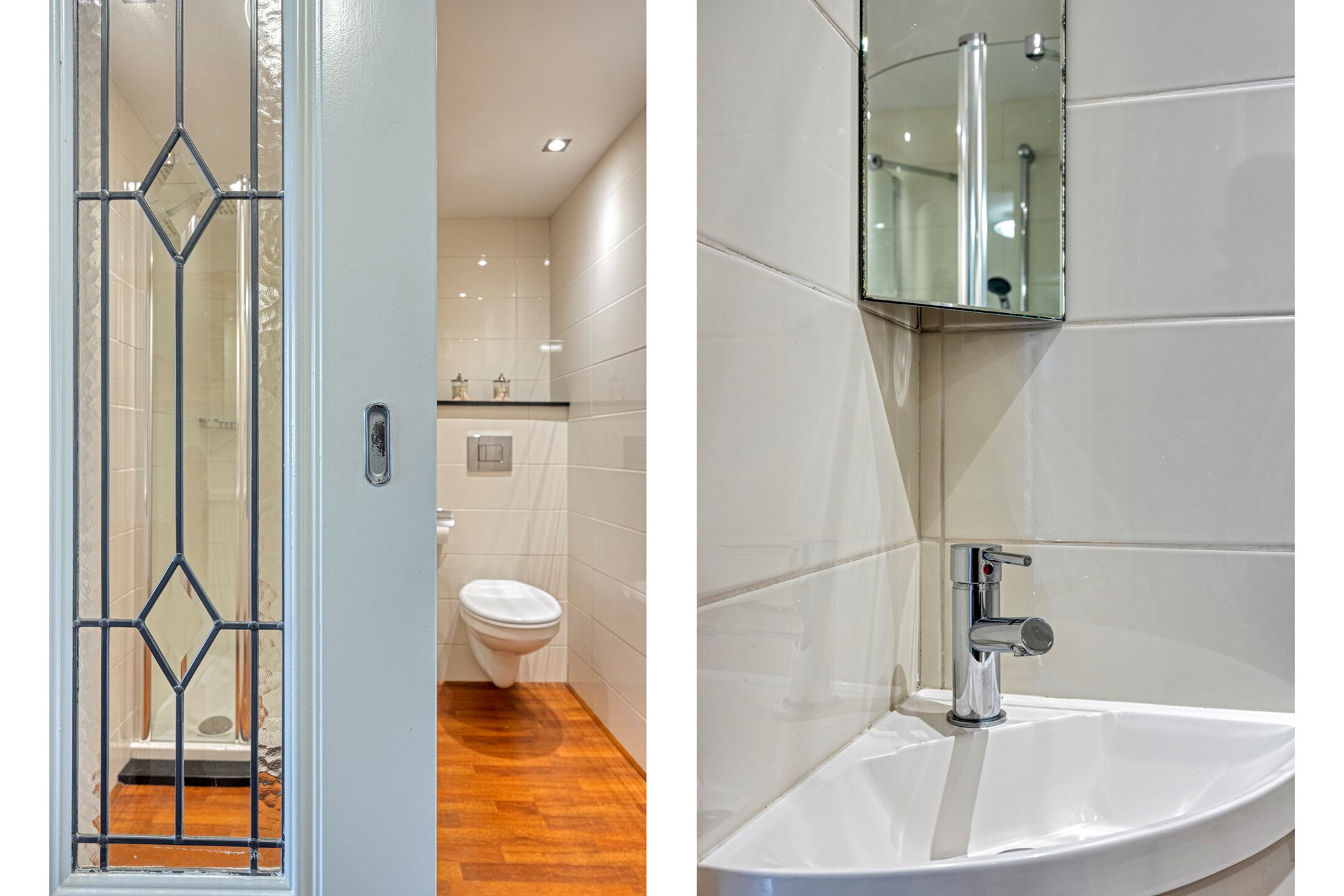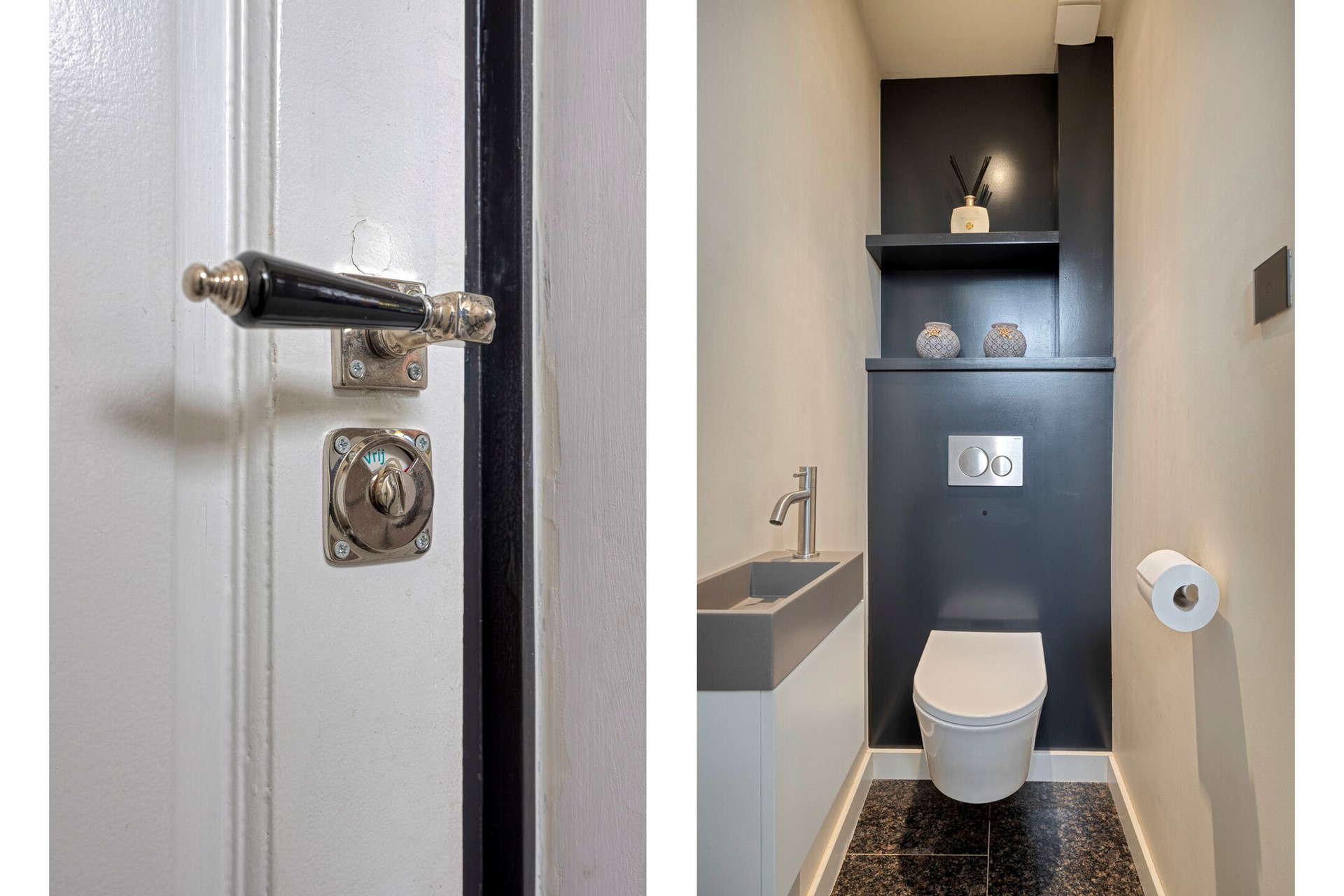Bij binnenkomst tref je een hal met modern toilet met fonteintje, gevolgd door een lichte en sfeervolle woonkamer van 33 m². De hoge plafonds en authentieke details zoals prachtige schouw en glas-in-loodramen creëren een warm welkom. Aansluitend ligt de moderne keuken van 11 m², voorzien van o.a. een natuurstenen werkblad, combi-oven, koelkast, vaatwasser en veel kast- en werkruimte. Vanuit de keuken kijk je uit op de stadstuin.