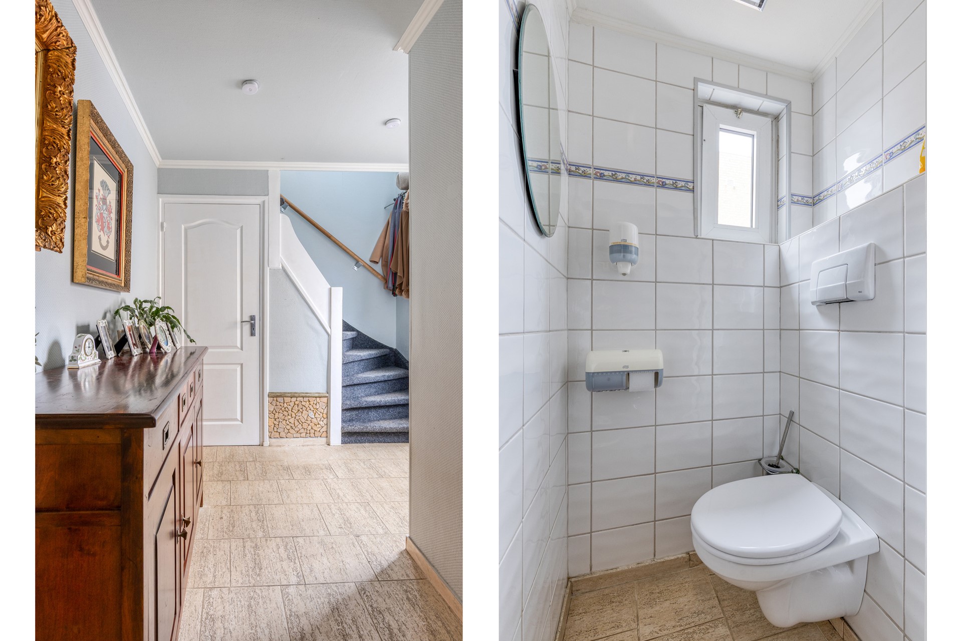Binnenkomst vindt plaats via de hal met meterkast, toiletruimte met hangend closet, trapopgang en een praktische garderobekast. Vanuit hier wordt direct de leefruimte bereikt.