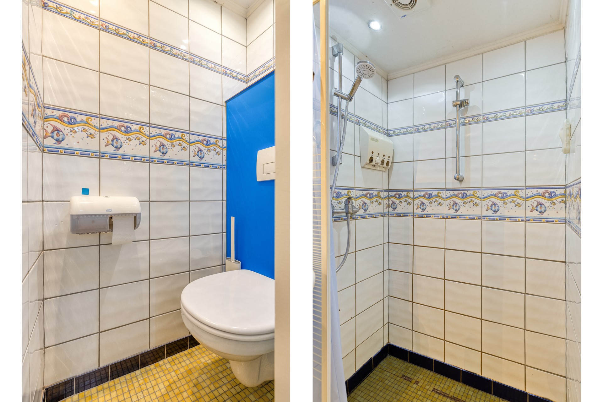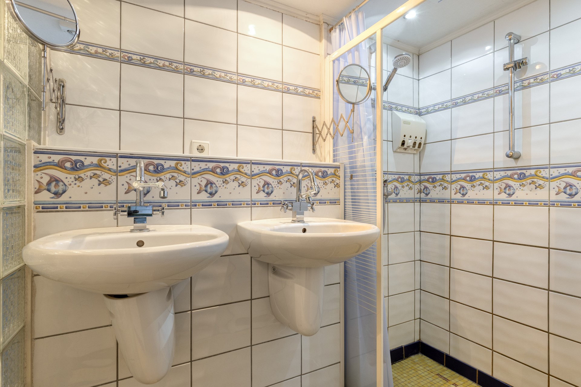 De badkamer is volledig betegeld en ingericht met een inloopdouche, twee wastafels, een tweede toilet en elektrische vloerverwarming. De ruimte is functioneel en biedt duidelijke kansen voor modernisering.