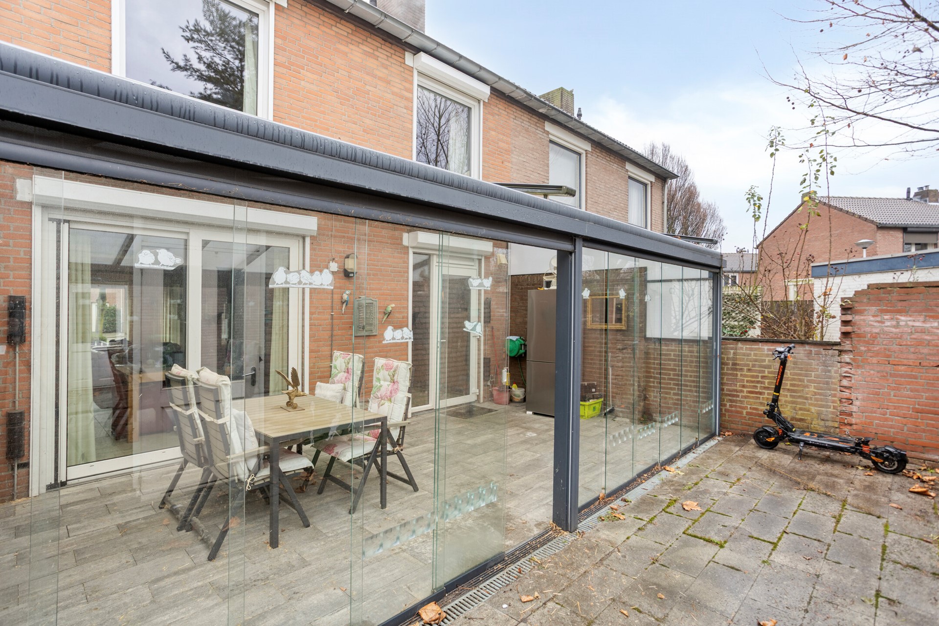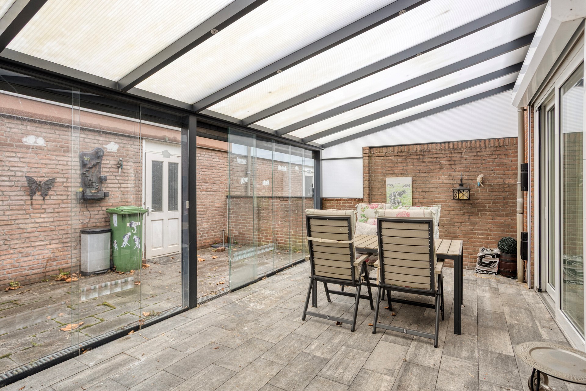 Achter de woning bevindt zich een royale veranda van circa 26 m² met glazen schuifpanelen. Een heerlijke plek om beschut te zitten en het buitenseizoen aanzienlijk te verlengen.