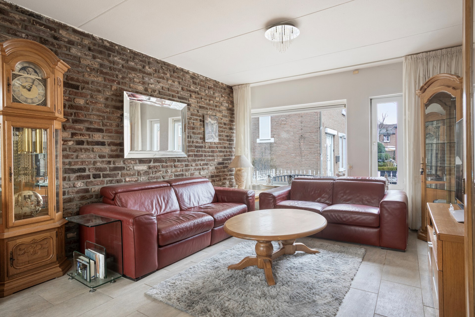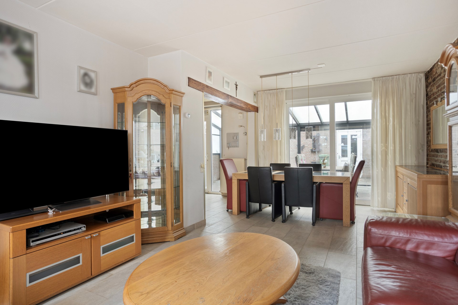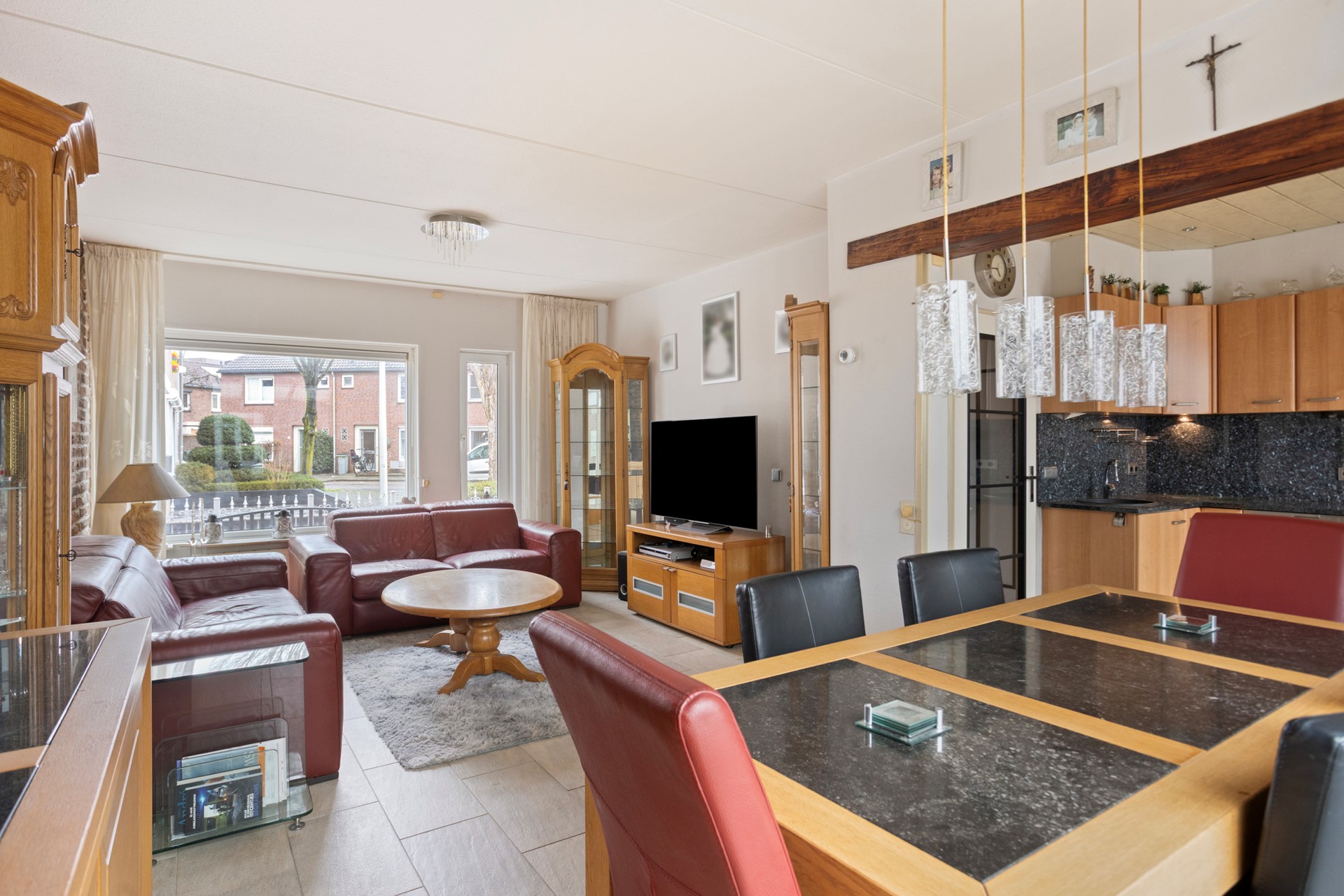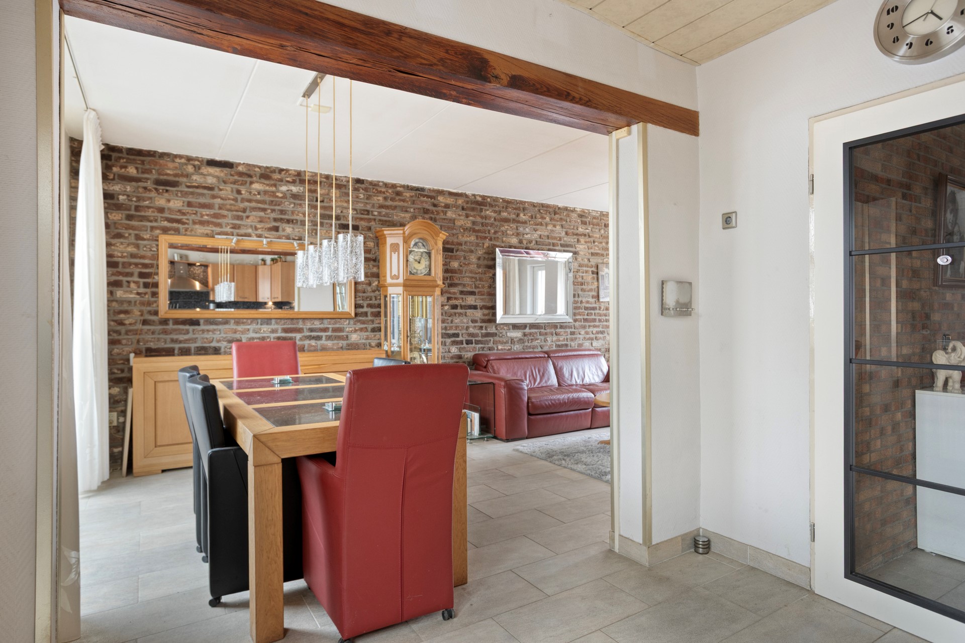 Aan de voorzijde bevindt zich het zitgedeelte met grote raampartij en uitzicht op de straat. Achterin sluit de eethoek mooi aan, waardoor een ruime en doorlopende leefruimte ontstaat. De schoonmetselwerk wand geeft karakter en warmte aan het geheel.
