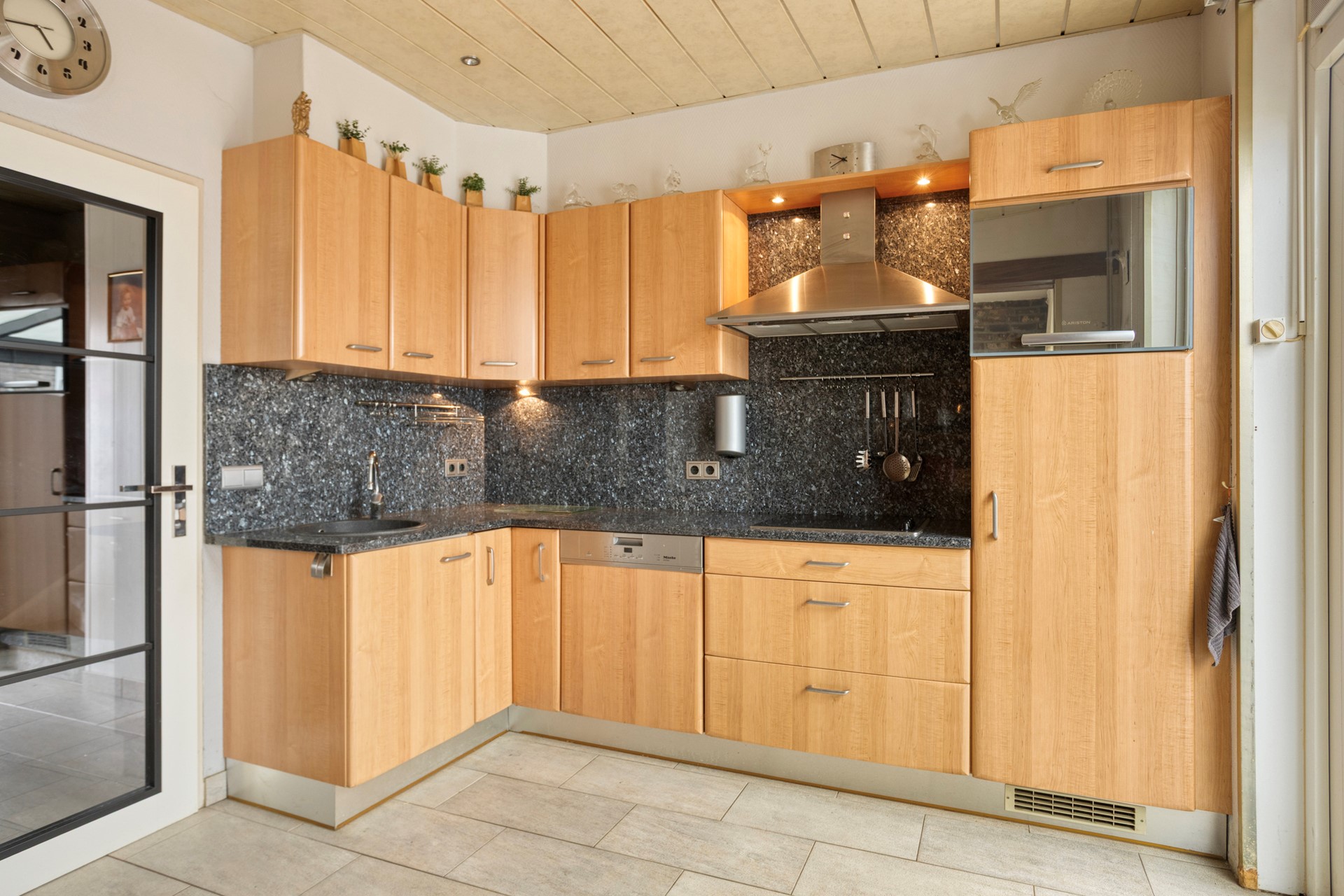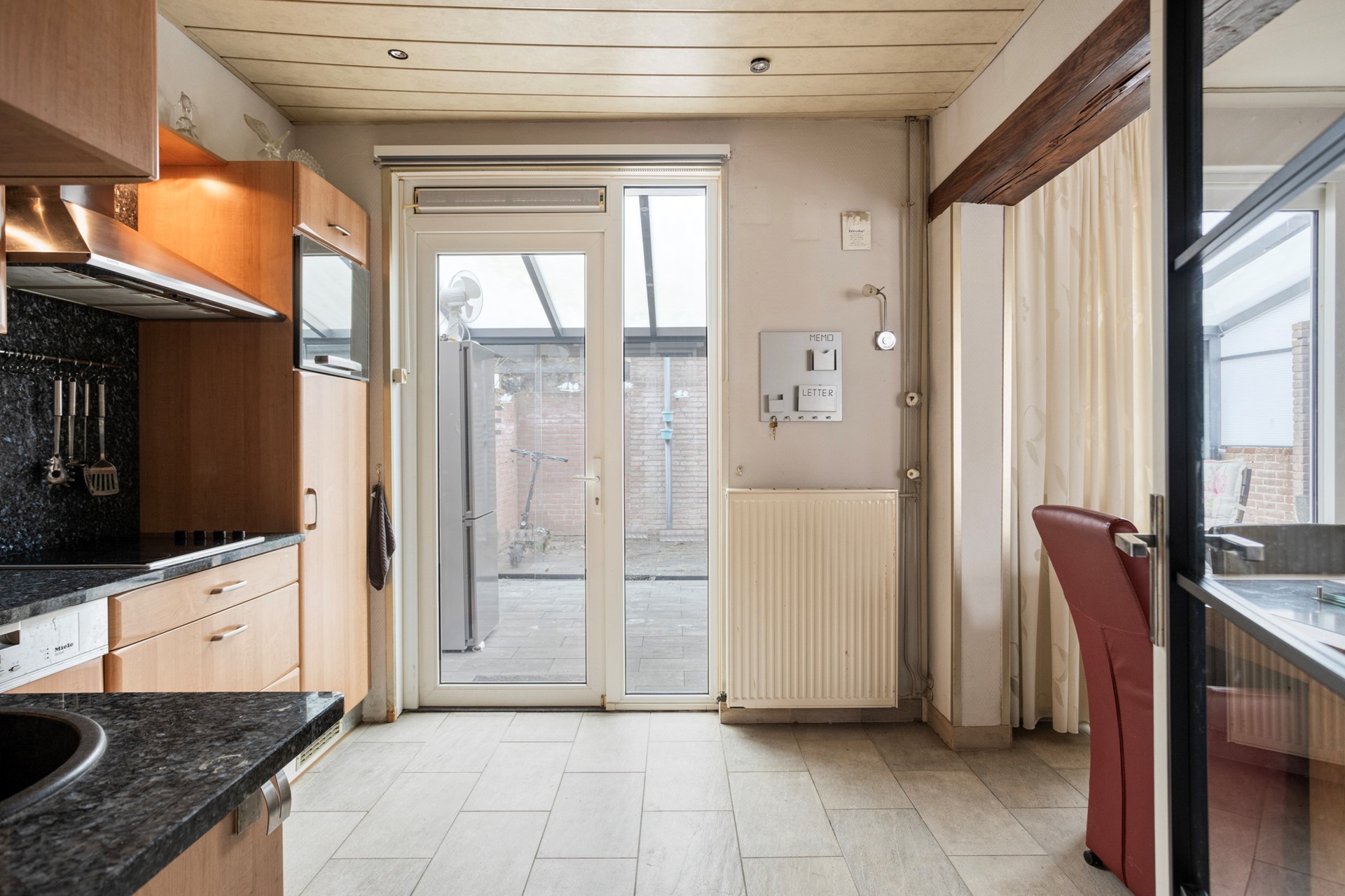 De keuken is praktisch ingericht in hoekopstelling en voorzien van vaatwasser, oven, inductiekookplaat en koelkast. Vanuit hier loop je direct de tuin in.