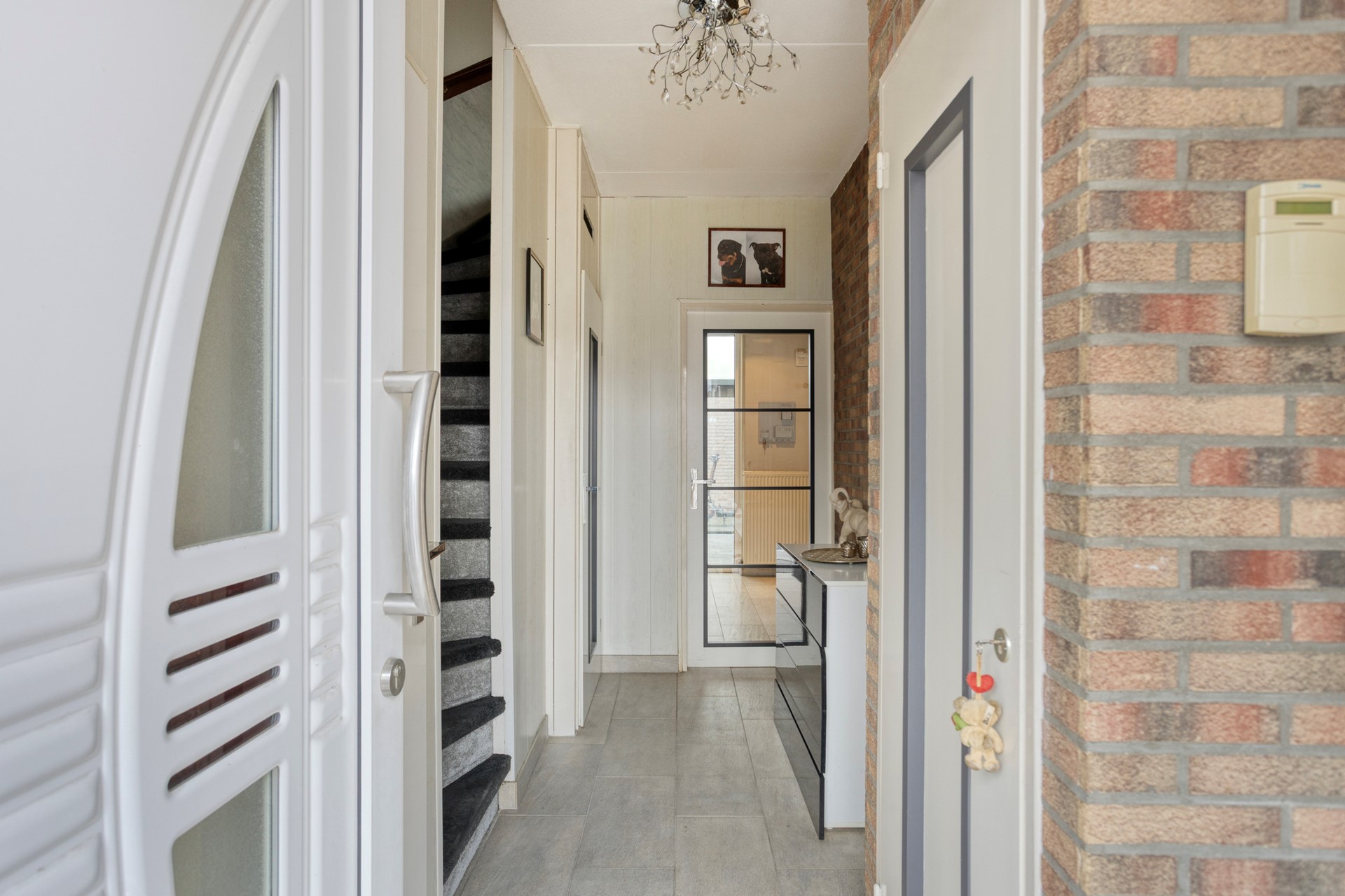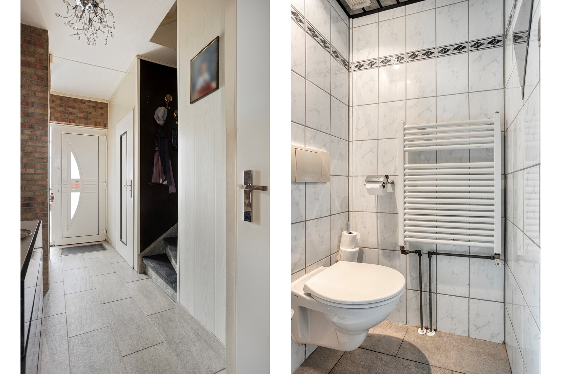 Binnenkomst via de overdekte entree met hal, toilet, meterkast en trapopgang.