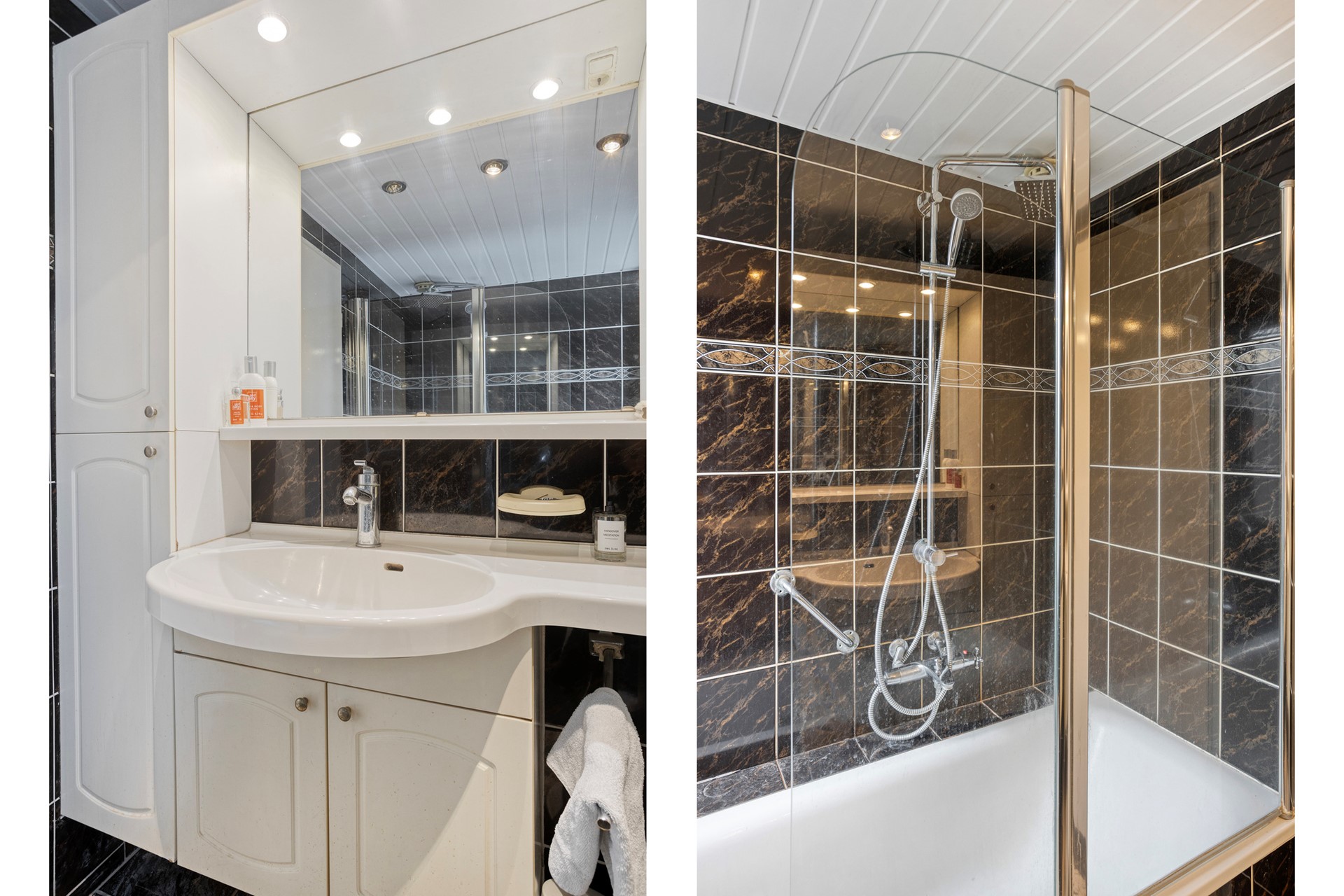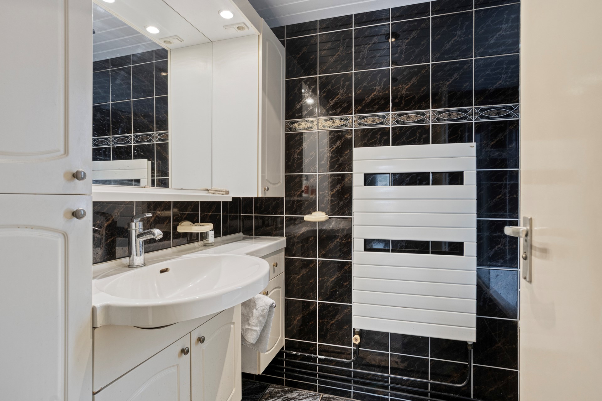 De volledig betegelde badkamer beschikt over een ligbad met douchewand, wastafelmeubel en designradiator. Netjes onderhouden en functioneel ingericht.
