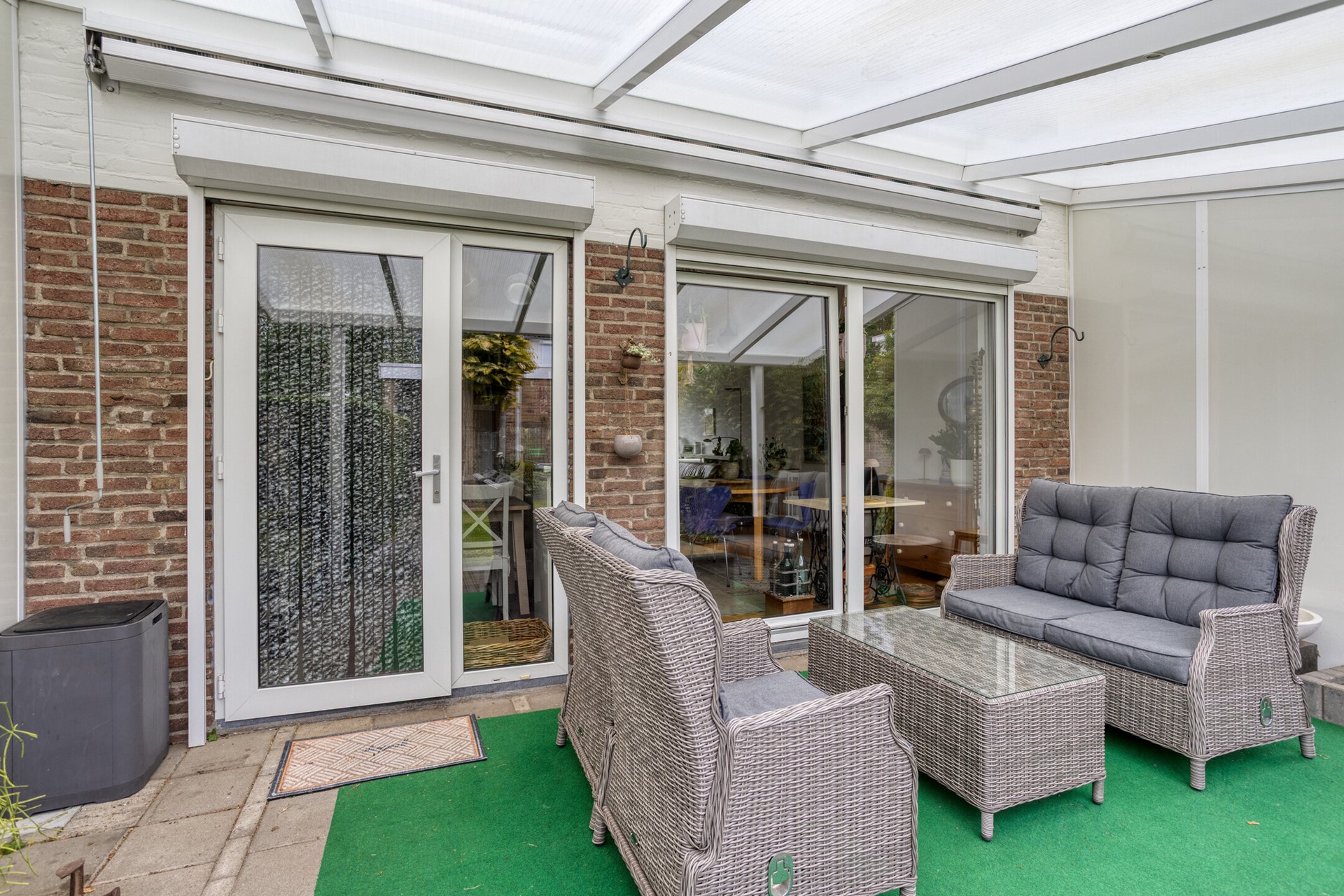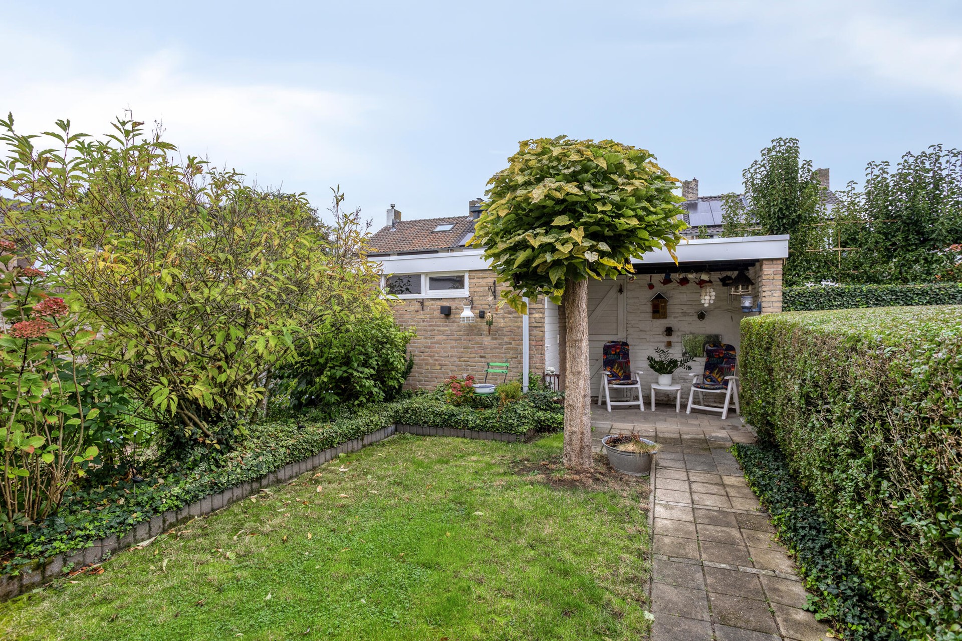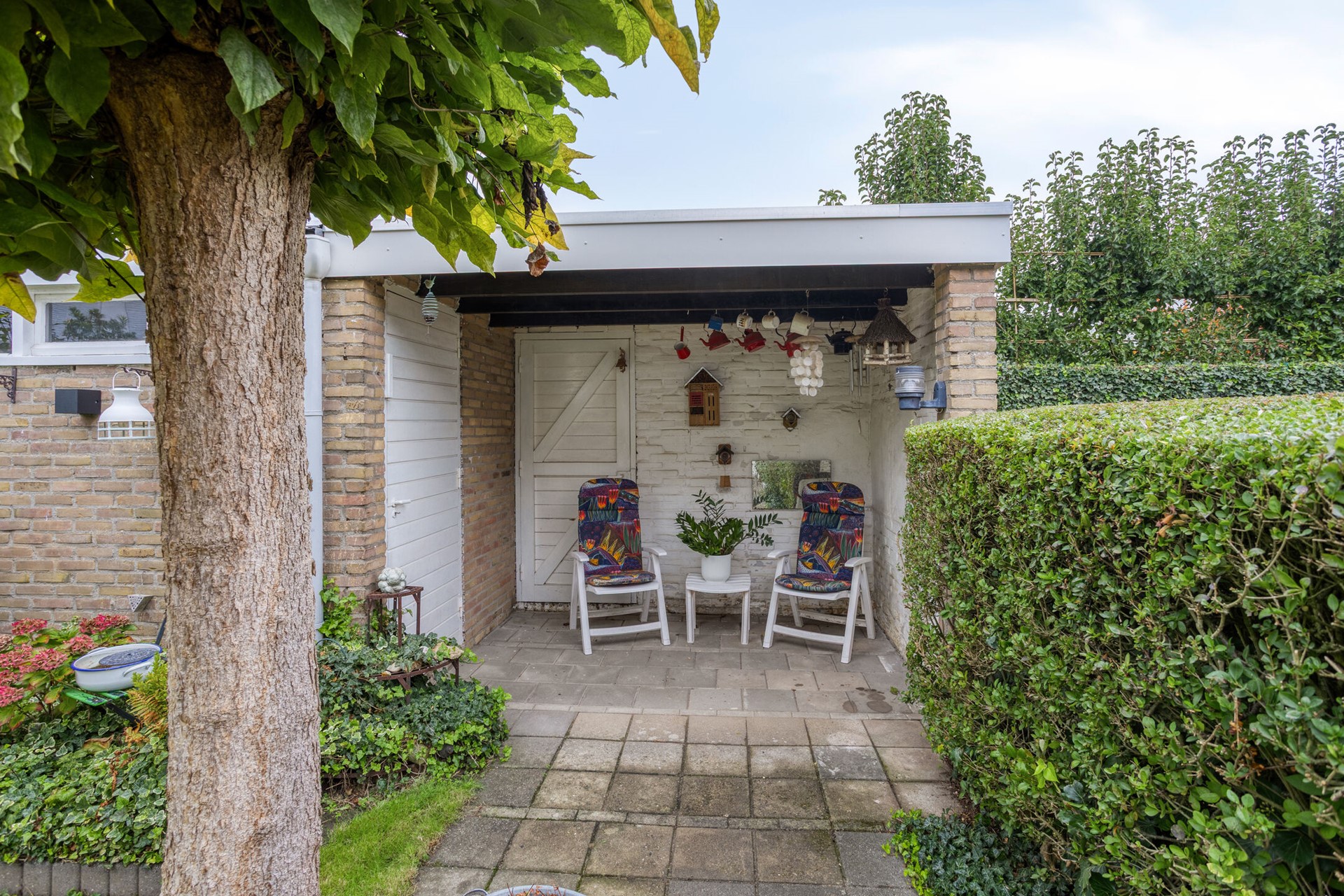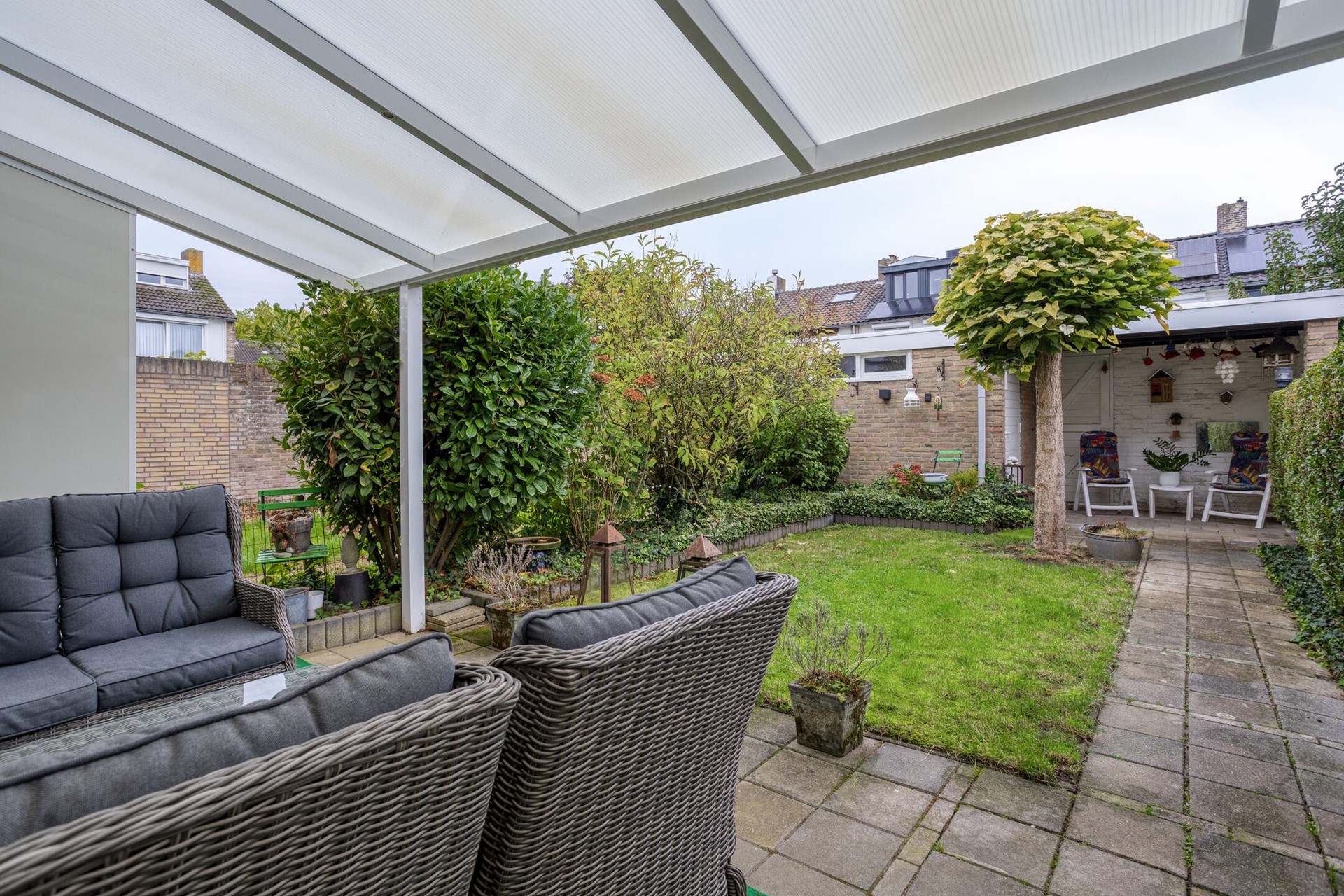 De achtertuin is verzorgd aangelegd met een overkapt terras, graspartij en volwassen beplanting. Achterin bevinden zich een berging en een tweede overkapping, en via de achterom is de tuin ook van buitenaf bereikbaar.