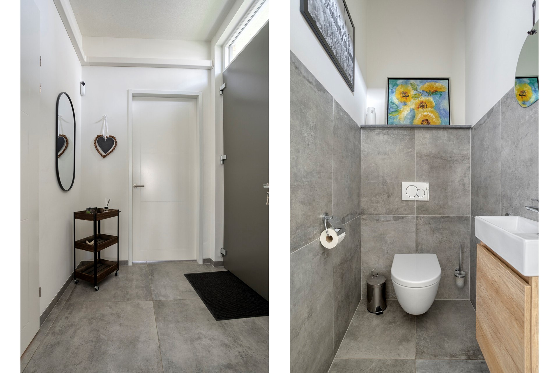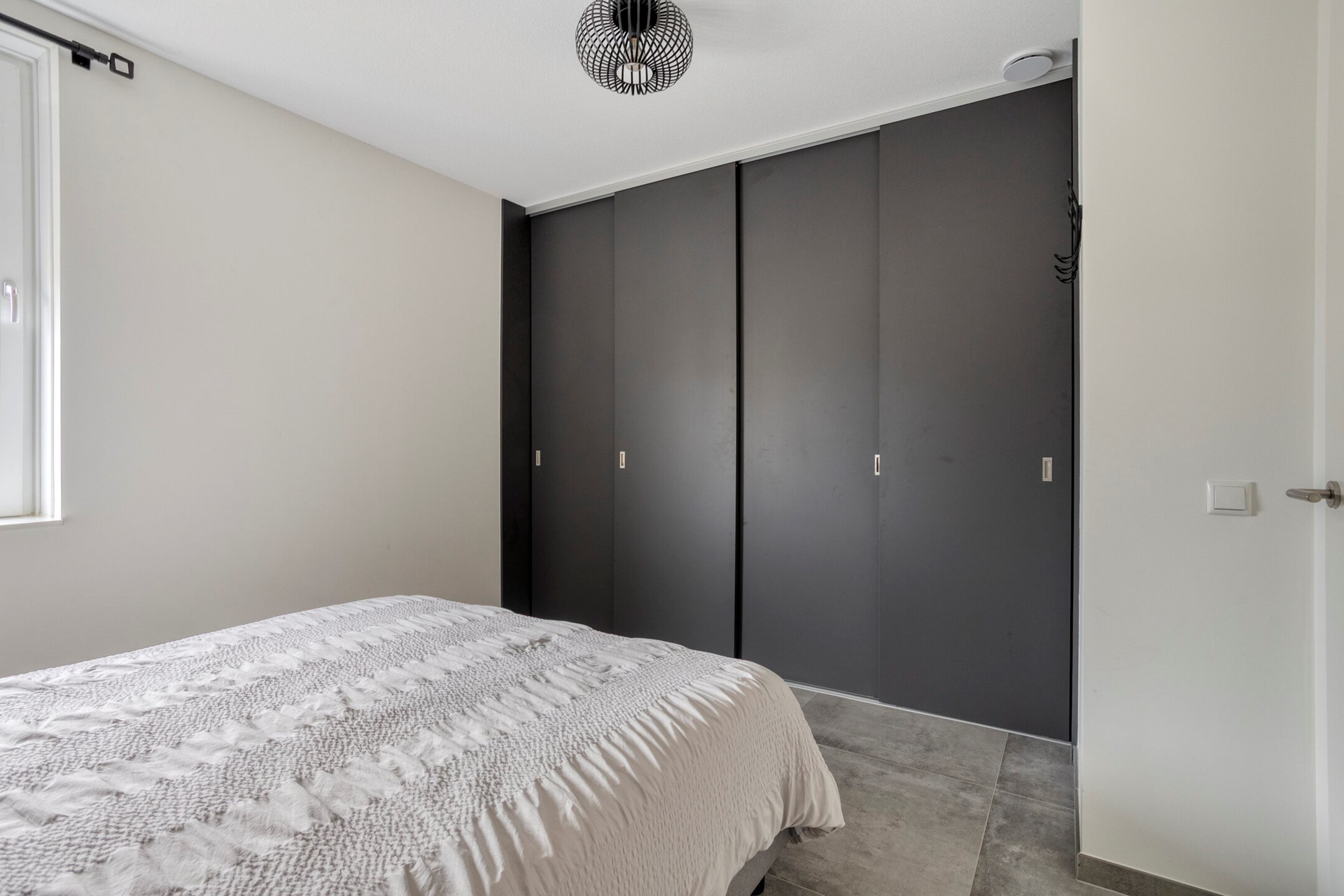 Aan de linkerzijde van de woning bevindt zich de studio, bereikbaar via een eigen entree. Deze ruimte is bewust multifunctioneel opgezet en biedt tal van gebruiksmogelijkheden. Denk aan een zelfstandige woonruimte voor oudere (inwonende) kinderen of ouders, maar ook aan een kantoor aan huis, praktijkruimte of werkstudio. De studio beschikt over een volwaardige keuken, een ruime slaapkamer en een badkamer ensuite met inloopdouche en wastafel. Het toilet is separaat gesitueerd, wat het zelfstandige karakter verder versterkt. Privacy en flexibiliteit komen hier op een natuurlijke manier samen.