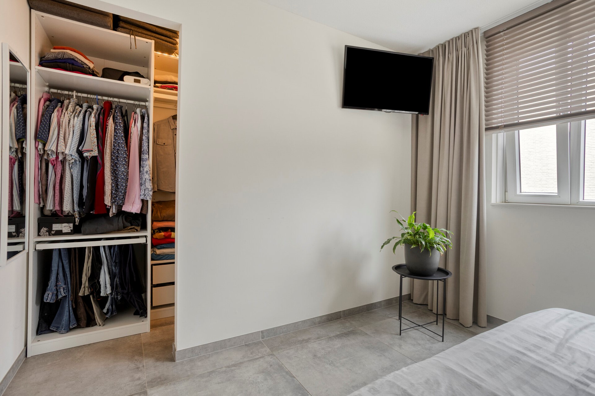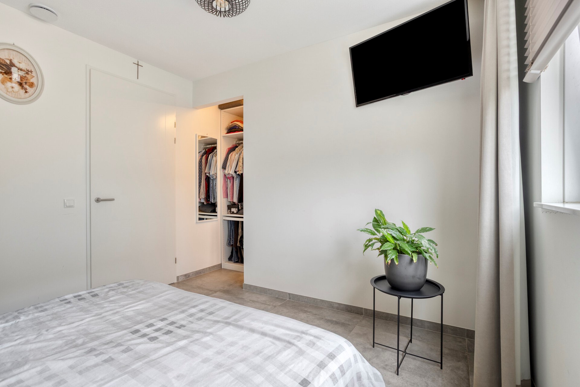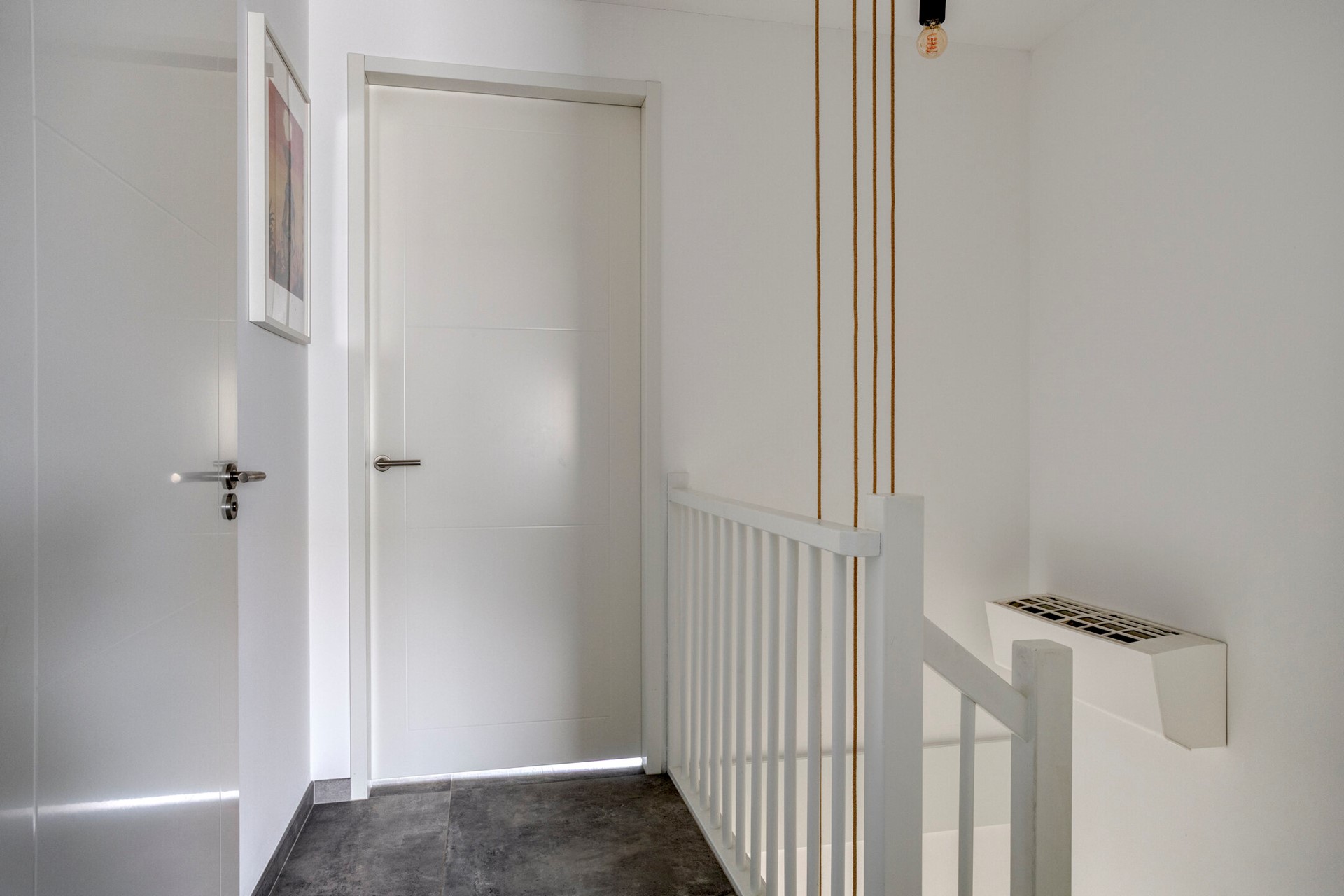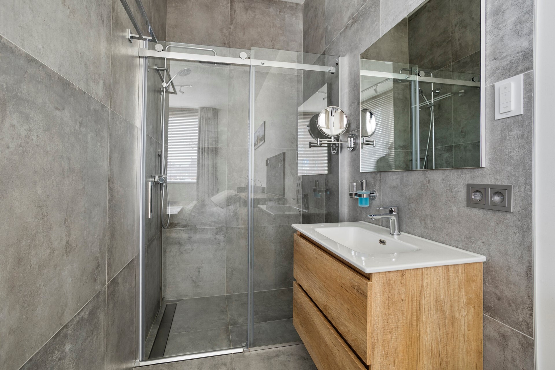 Op deze verdieping ligt ook een comfortabele slaapkamer met inloopkast, ideaal als master bedroom of als rustige privéruimte. Verder is hier een praktische technische ruimte aanwezig met de warmtepomp, warmteterugwininstallatie, wasmachineaansluiting, wastafel en een sanibroyeur, waarmee deze verdieping eveneens beschikt over een toiletvoorziening. In de wandkast richting het dakterras is bovendien een compact koelkastje geïntegreerd, een doordacht detail dat het verblijf op deze verdieping extra comfortabel maakt, zodat je voor iets koels niet steeds naar beneden hoeft.