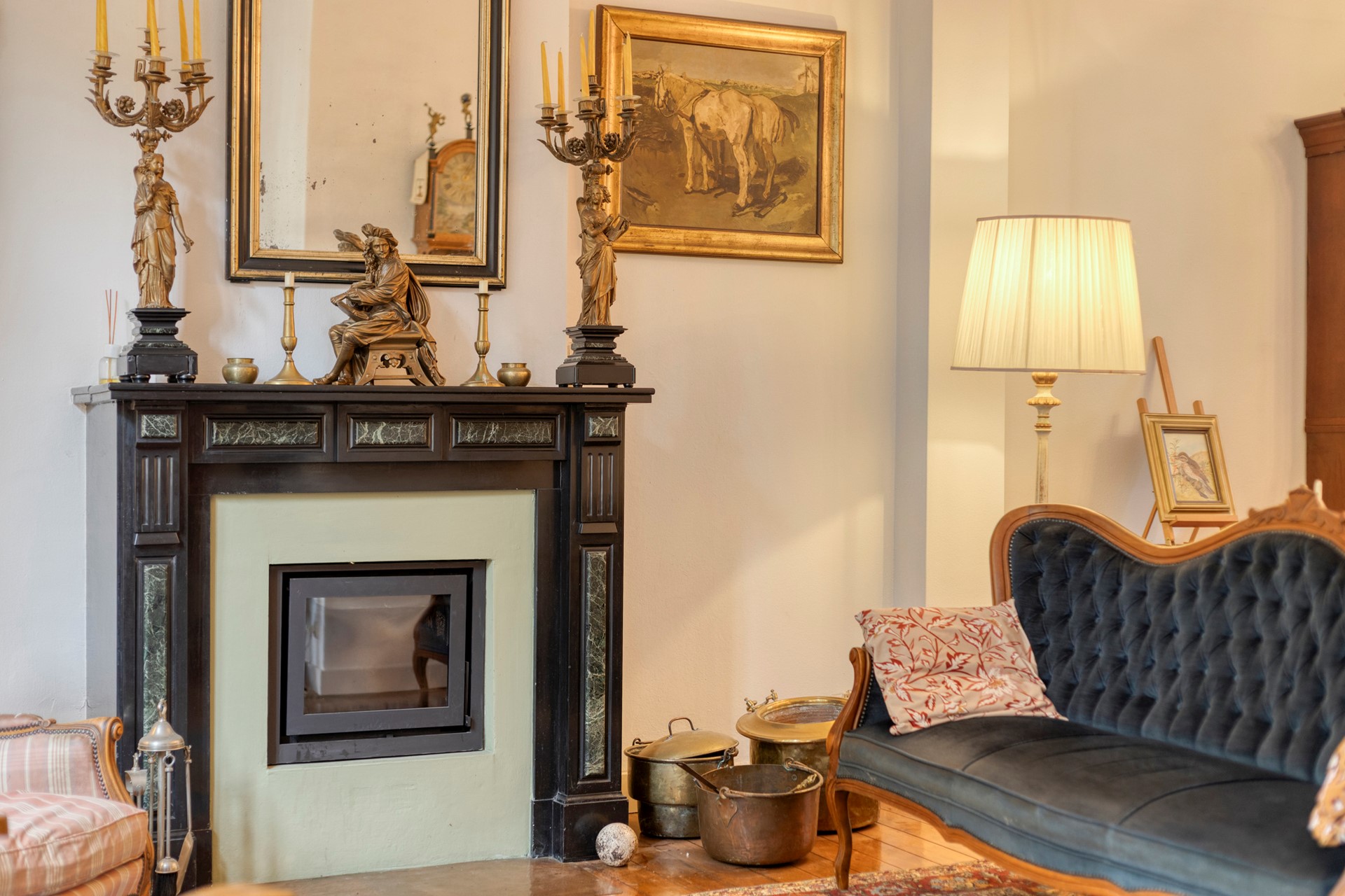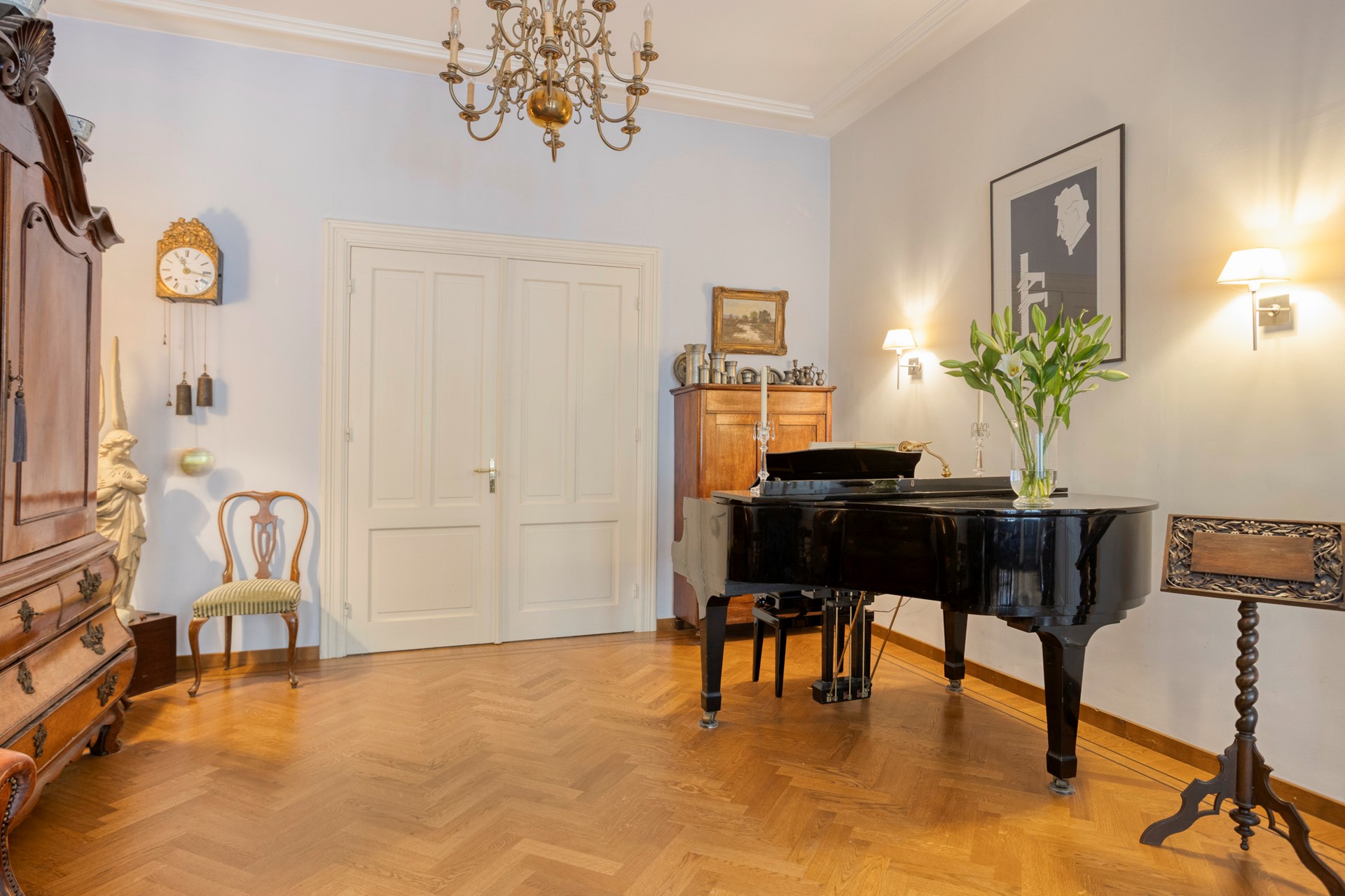 Op de eerste verdieping bevindt zich de (tweede) woonkamer: een royale L-vormige ruimte met een schouw, hoge plafonds met sierlijsten en prachtig lichtinval via openslaande deuren naar het balkon aan de straatzijde. Hier komt de sfeer van de woning volledig tot leven, met een fraai uitzicht op de Lambertuskerk.