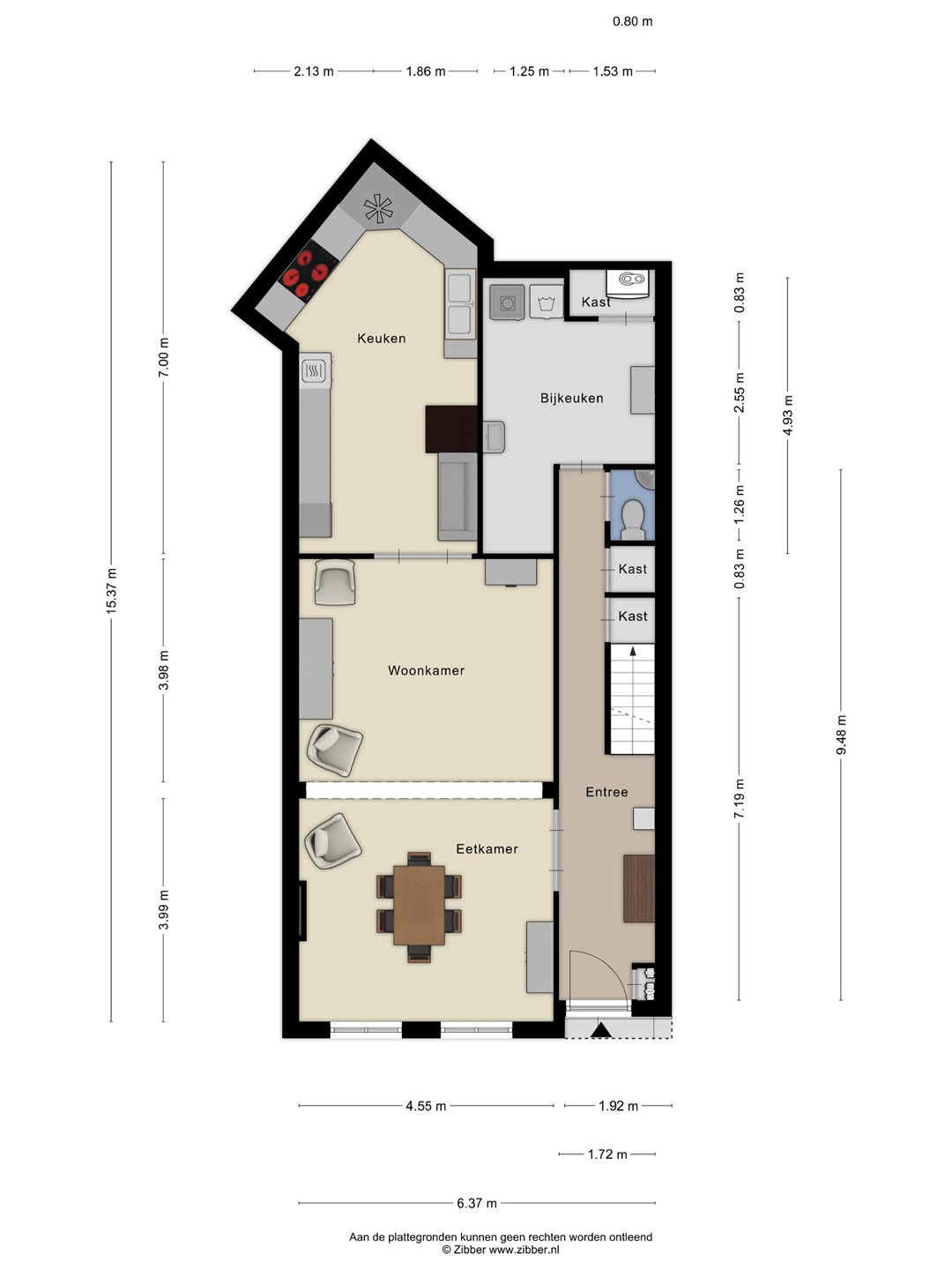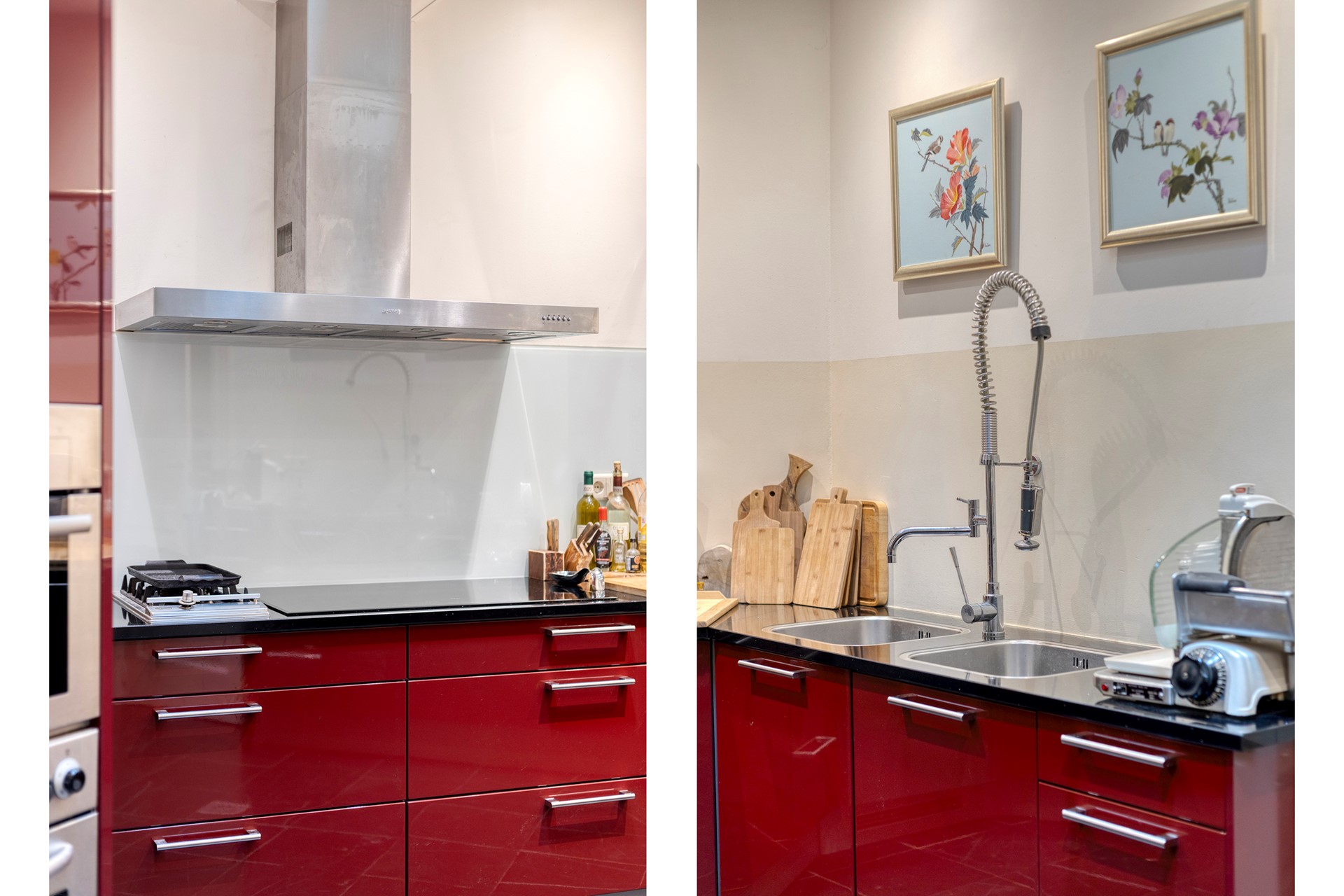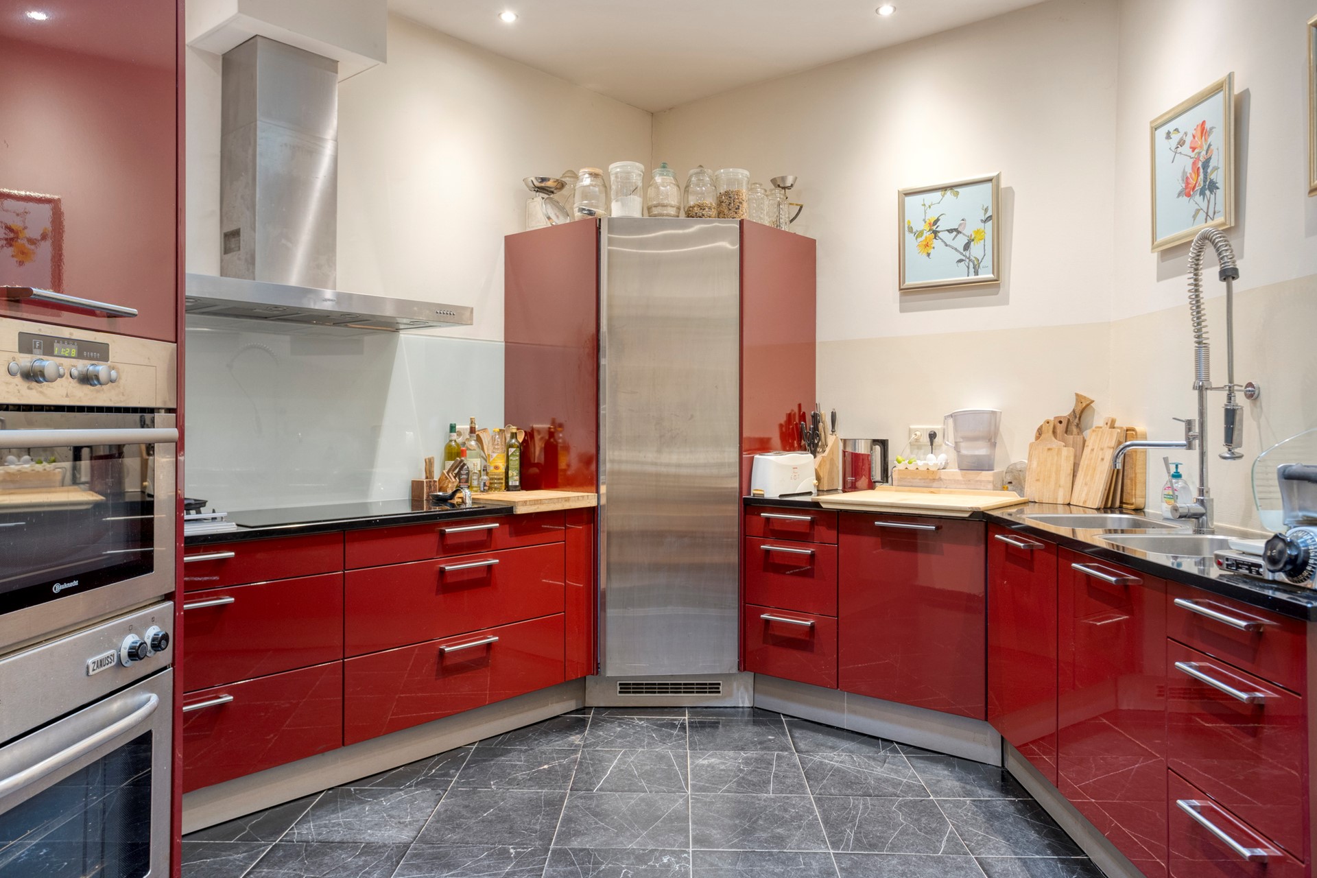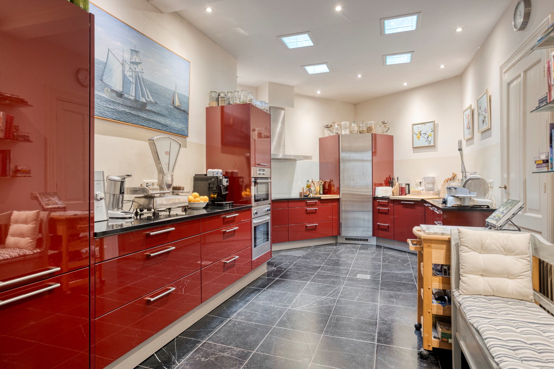 De keuken is verrassend ruim en modern ingericht met glanzend rode fronten, natuurstenen werkblad en een compleet scala aan inbouwapparatuur. Hier komen stijl en functionaliteit harmonieus samen. De aangrenzende bijkeuken biedt extra bergruimte en aansluiting voor witgoed. Een andere opzet, bijvoorbeeld met een (extra) woonkamer op de begane grond, behoort uiteraard tot de mogelijkheden.