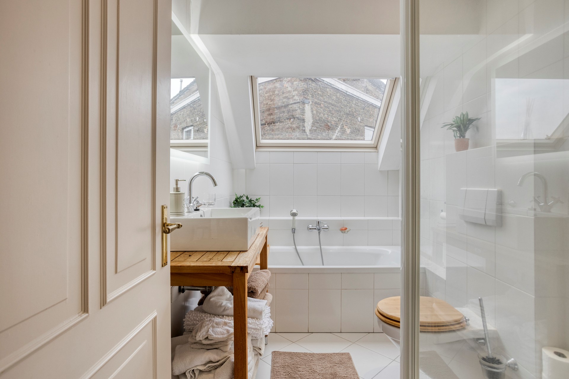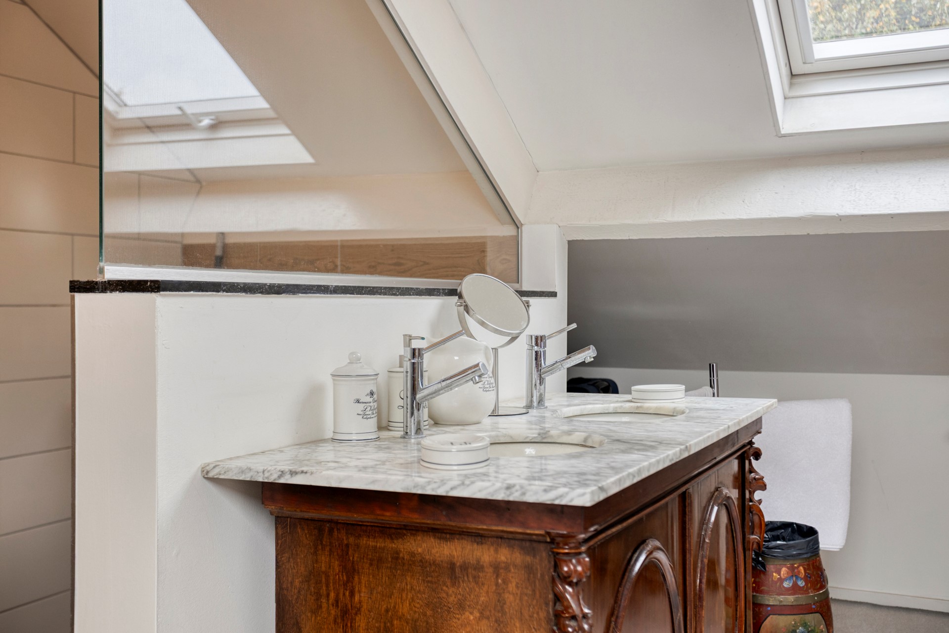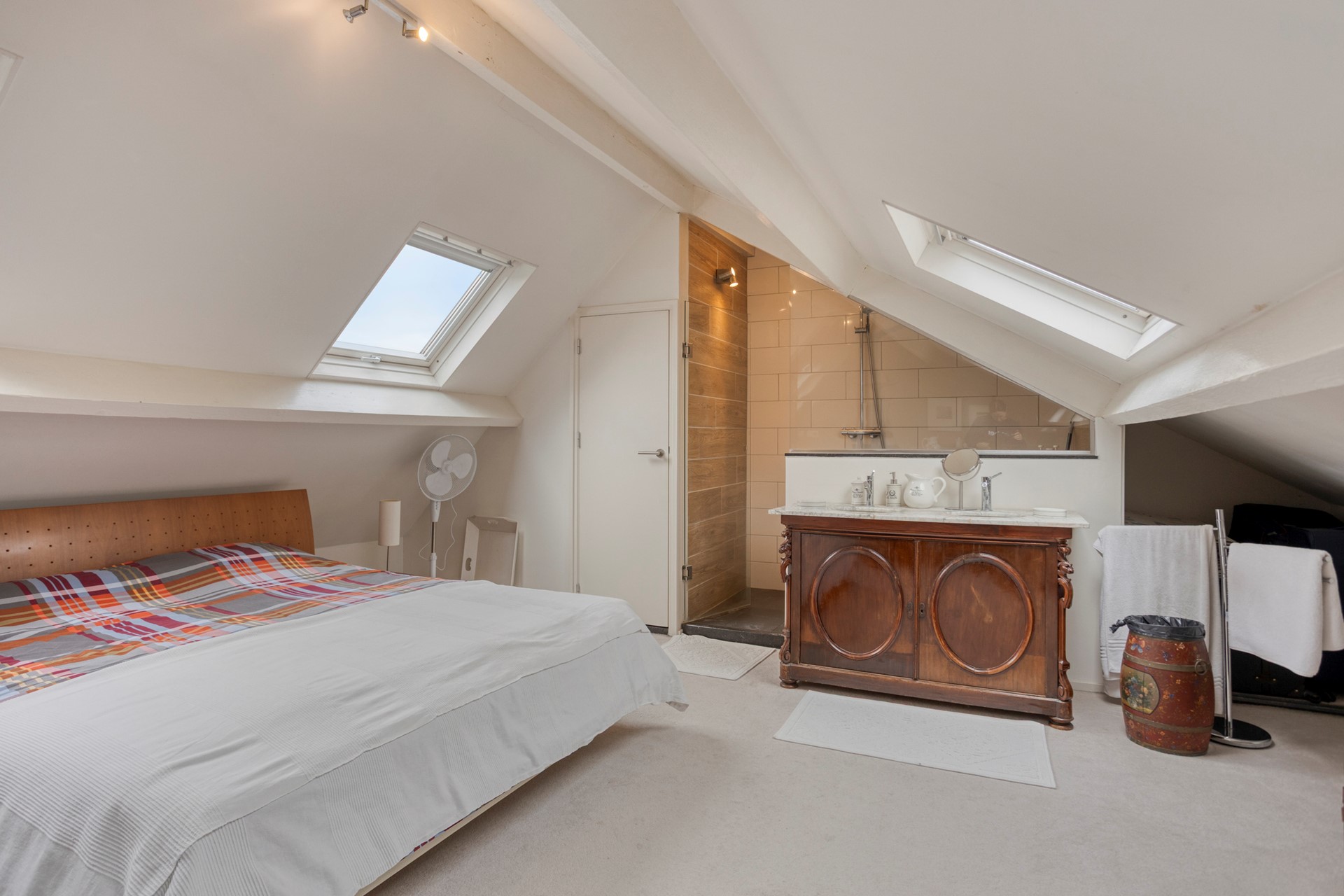De bovenste verdieping is ingericht als hoofdslaapkamer met badkamer ensuite. De schuine daklijnen, originele balken en dakramen zorgen voor een sfeervolle ambiance. De badkamer is voorzien van een inloopdouche, wastafelmeubel met dubbele wastafel en (vierde) toilet. Een stijlvolle, comfortabele privéverdieping die aanvoelt als een hotel suite.
