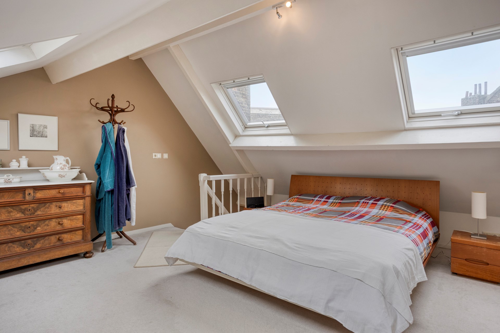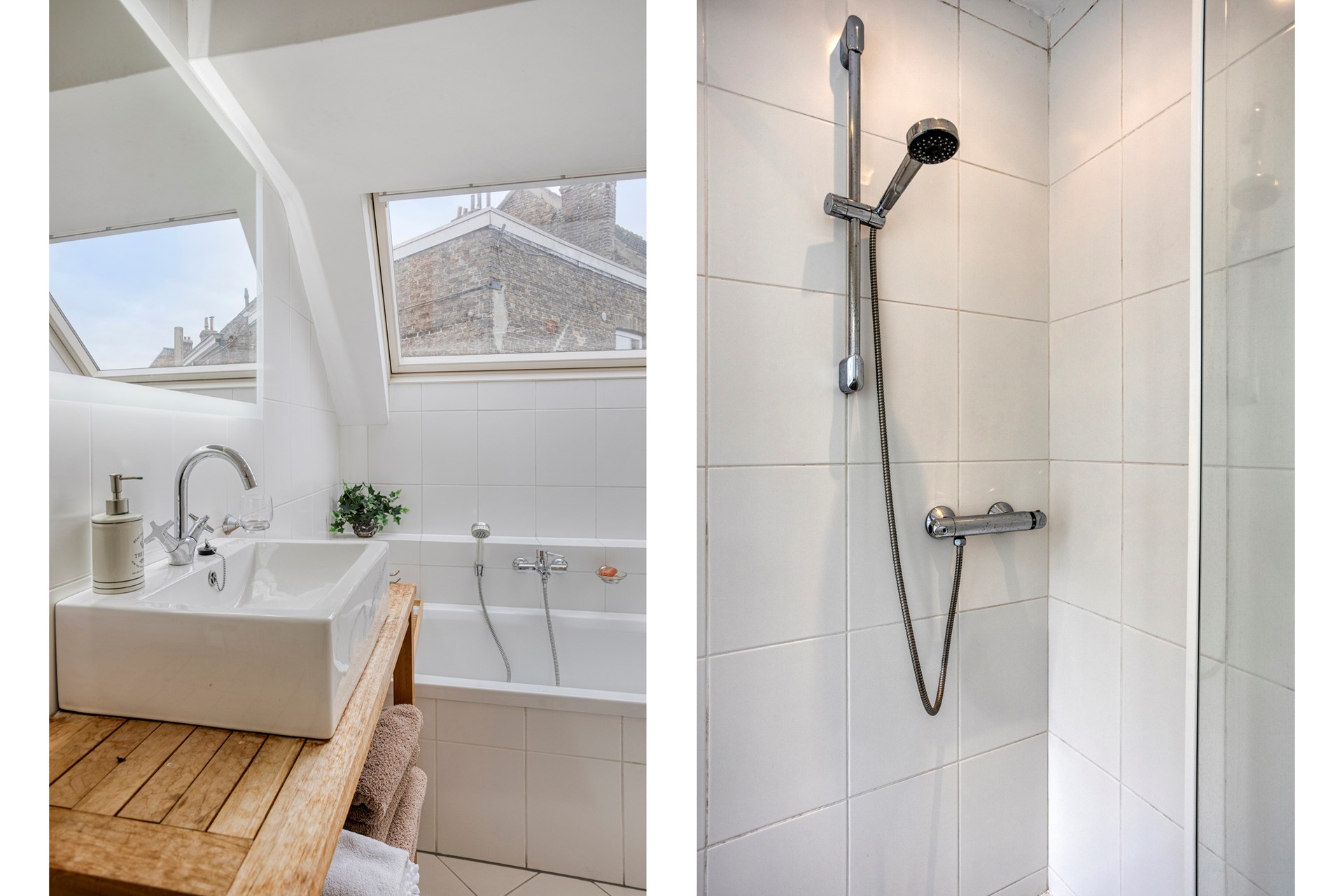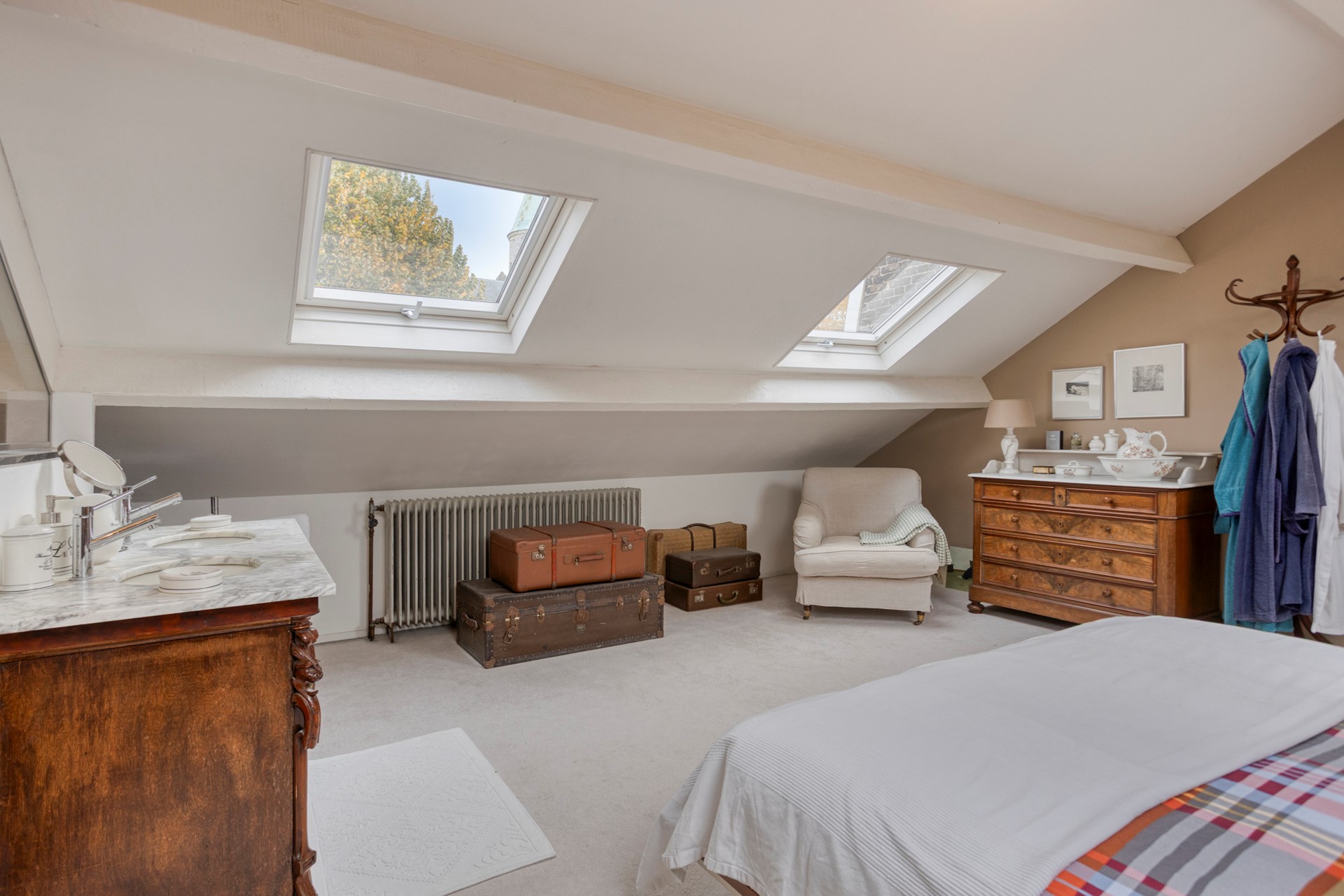 De bovenste verdieping is ingericht als hoofdslaapkamer met badkamer ensuite. De schuine daklijnen, originele balken en dakramen zorgen voor een sfeervolle ambiance. De badkamer is voorzien van een inloopdouche, wastafelmeubel met dubbele wastafel en (vierde) toilet. Een stijlvolle, comfortabele privéverdieping die aanvoelt als een hotel suite.