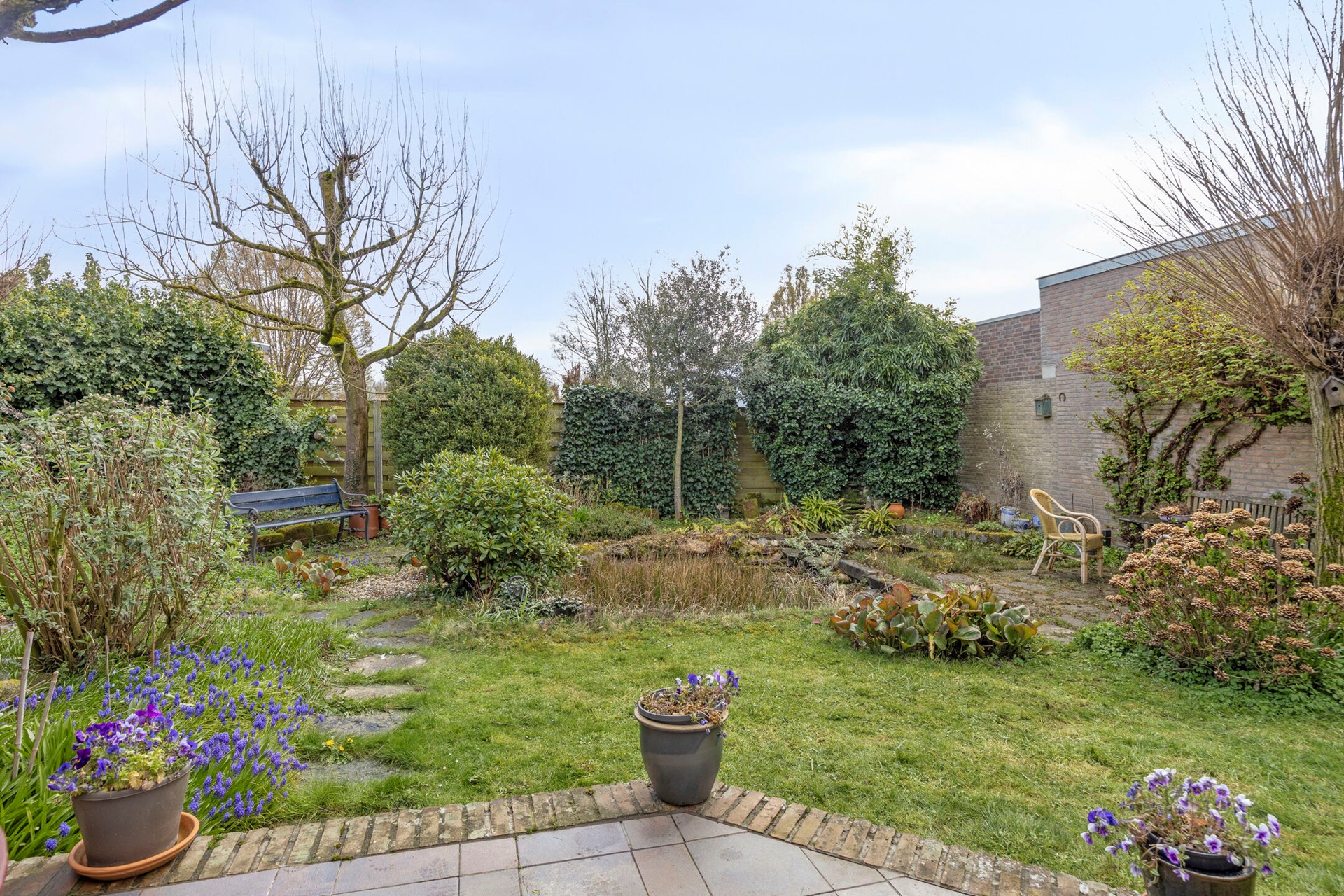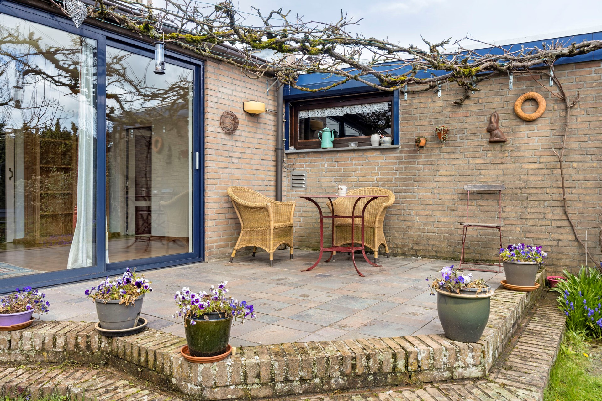 Rondom de woning ligt een groene, volwassen tuin met veel privacy. Verschillende plekken maken het eenvoudig om op elk moment van de dag een fijne zitplek te vinden. Het terras sluit direct aan op de woning en versterkt het gevoel van buiten wonen.