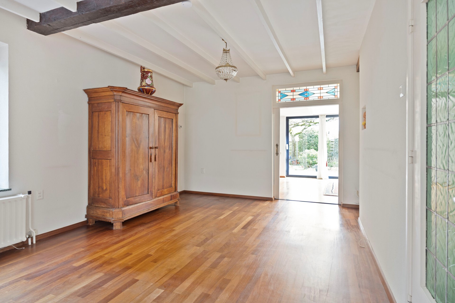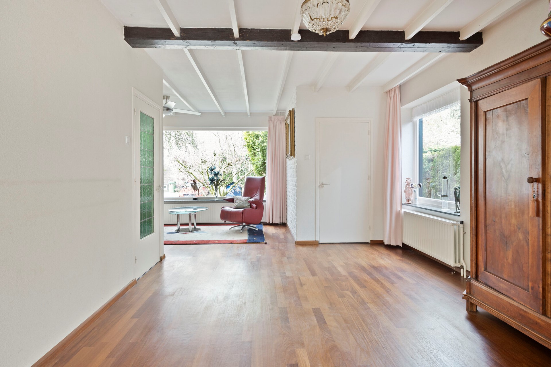 Binnenkomst in de hal met meterkast en toiletruimte. Vanuit hier opent de woning zich naar een verrassend ruime en speels ingedeelde leefruimte. De woonkamer voelt licht en comfortabel aan, met een houten vloer en prettige zichtlijnen richting de tuin.