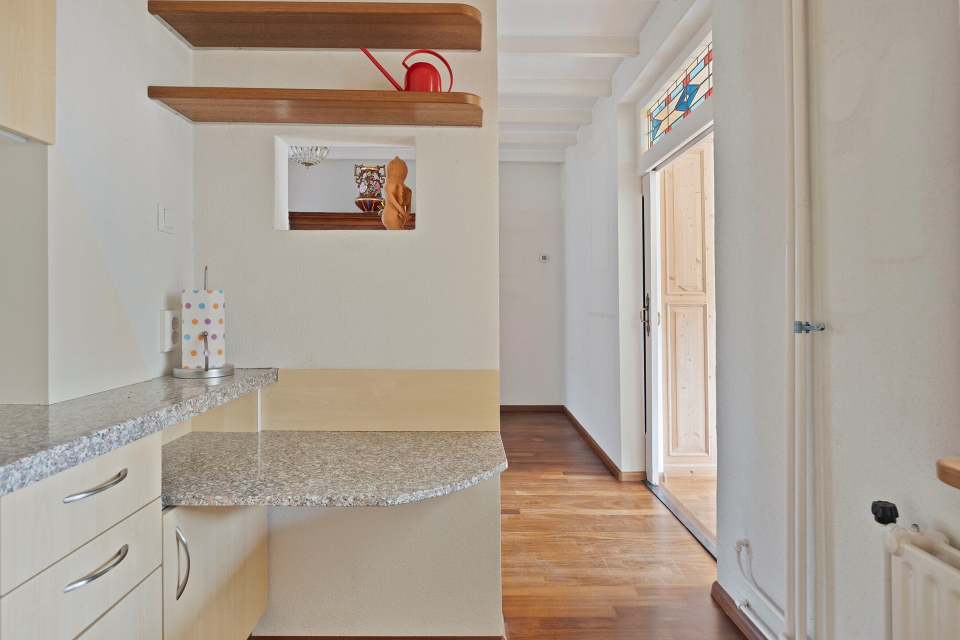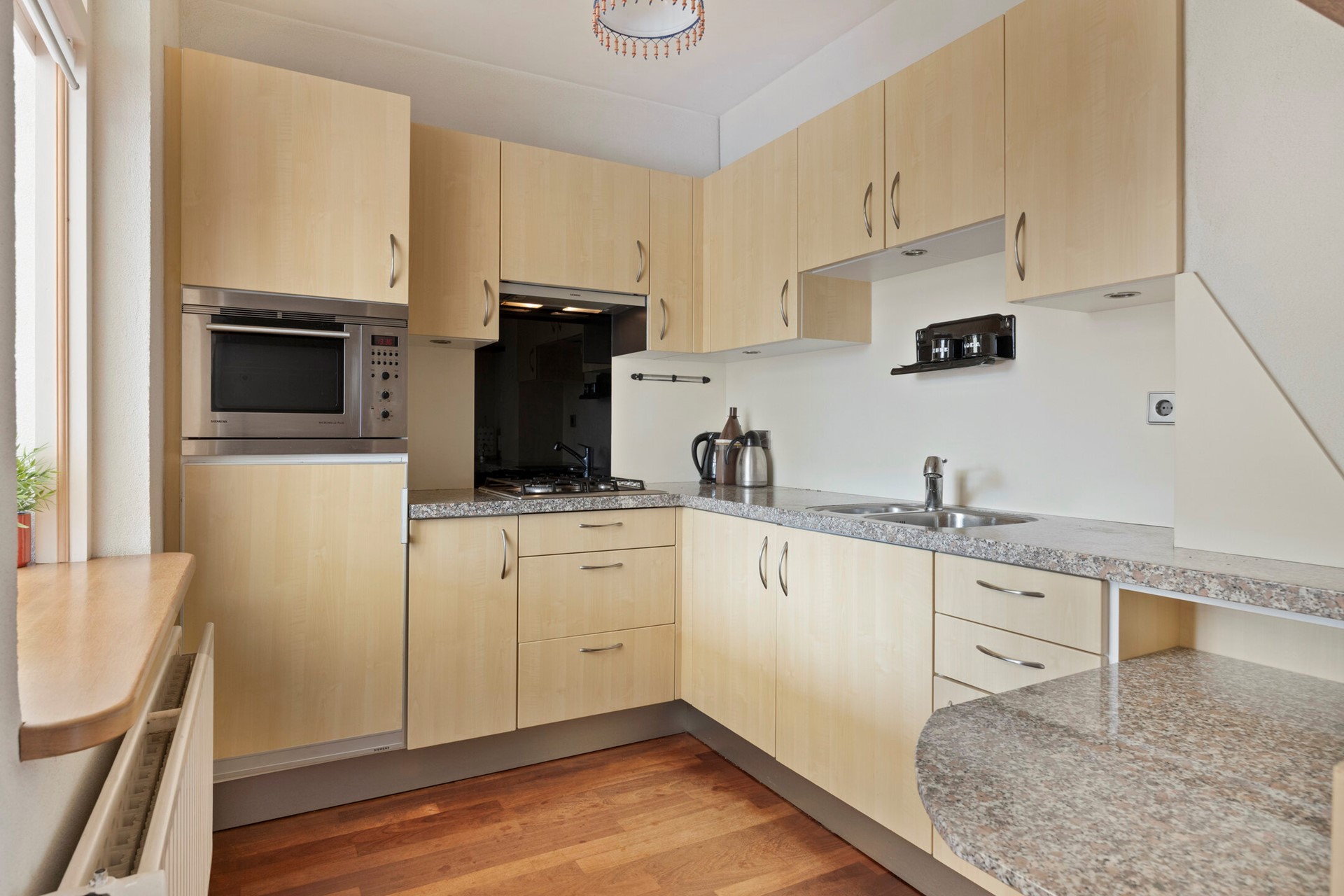 De keuken is praktisch ingericht in hoekopstelling en voorzien van inbouwapparatuur, met een directe verbinding naar zowel het zitgedeelte als de eetruimte.