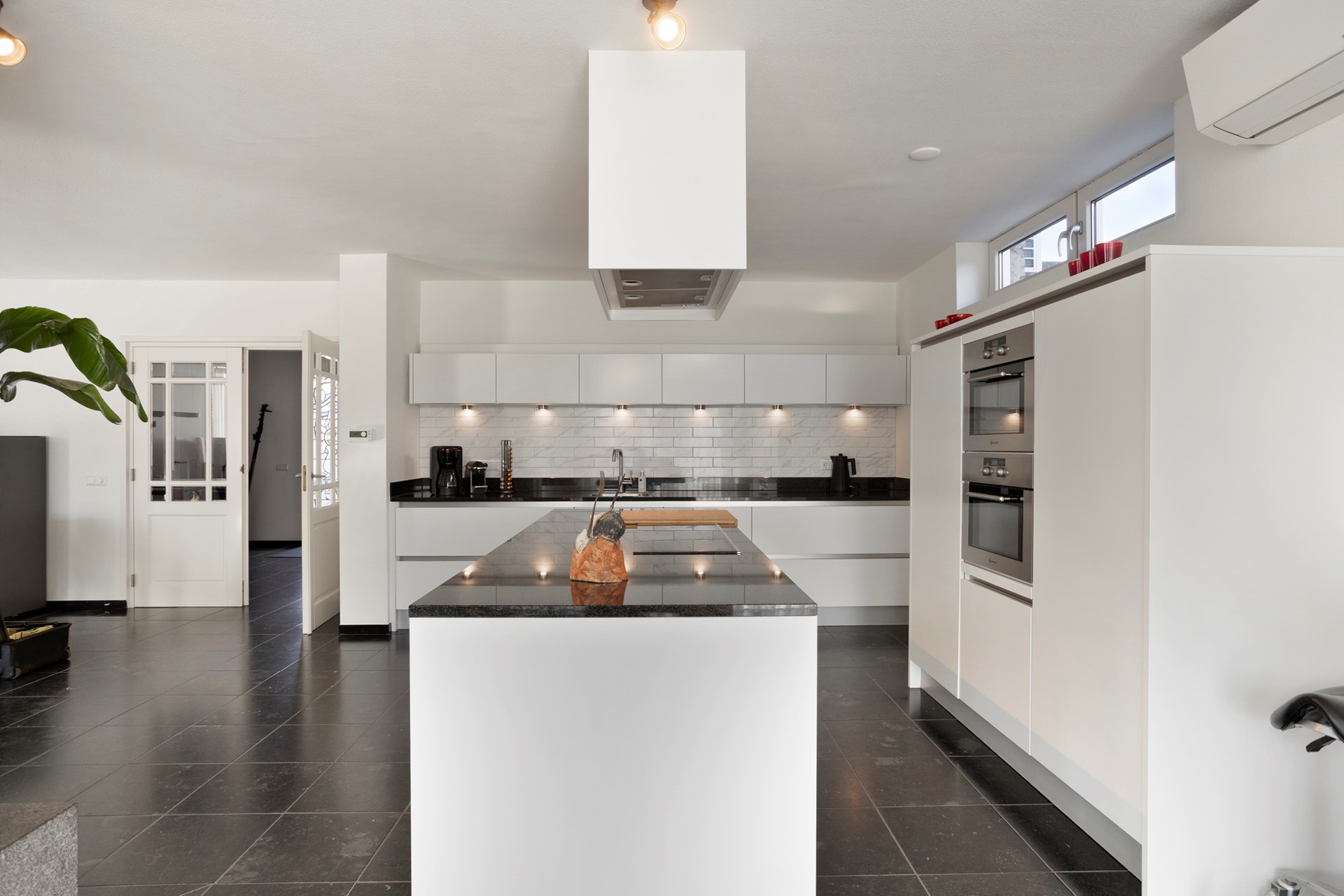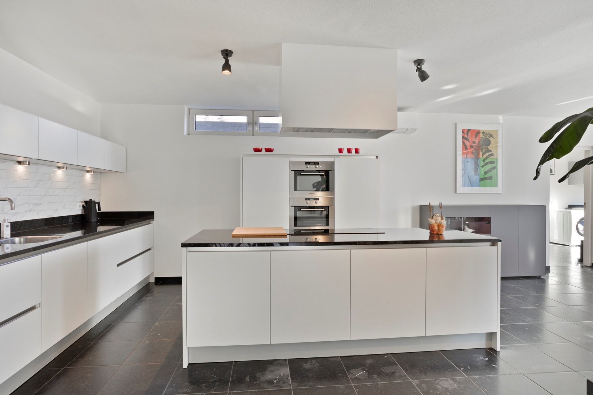 De keuken (circa 16 m²) is o.a. voorzien van greeploze witte fronten, een breed natuurstenen werkblad, een royaal kookeiland met inductiekookplaat en geïntegreerde afzuiging en tweemaal oven magnetron grill. De hoogwaardige materialen en uitvoering zorgen voor een luxe, tijdloze uitstraling.