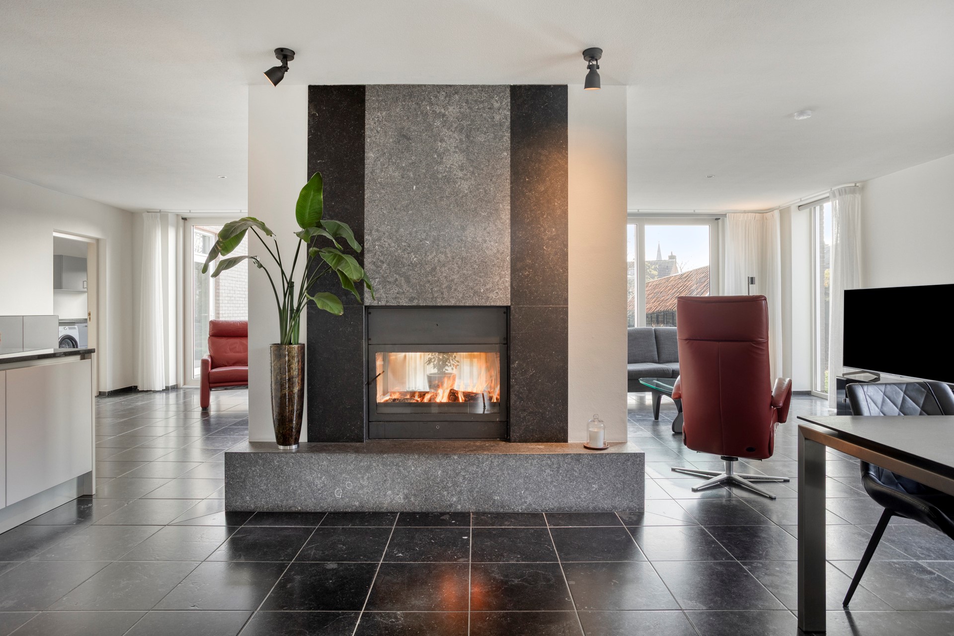 De woonkamer van circa 60 m² (exclusief keuken) is een sfeervolle en lichte leefruimte met een natuurstenen vloer in grote zwarte tegels. Grote ramen en schuifpuien brengen veel daglicht binnen en verbinden binnen met buiten. De houtkachel vormt een warm middelpunt en is, in combinatie met de airco’s, een energiezuinige manier om te verwarmen.
