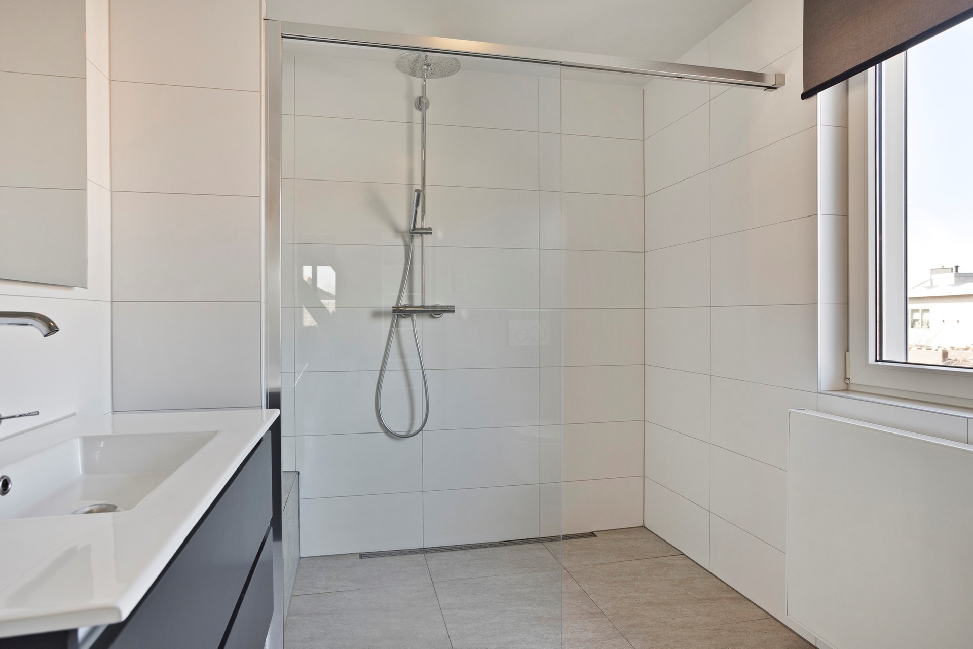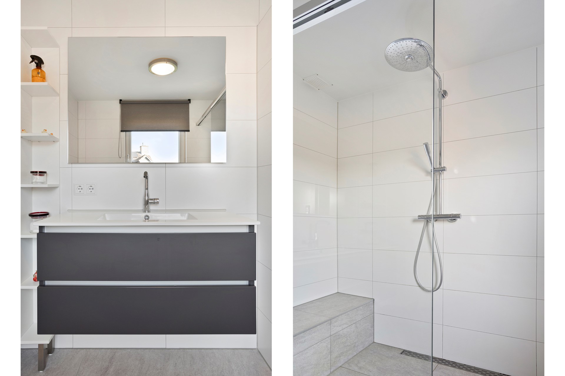 De badkamer werd in 2019 vernieuwd en is volledig betegeld. Deze is voorzien van een ruime inloopdouche met glazen wand, een breed wastafelmeubel met greeploze laden en een grote spiegel. De lichte, moderne afwerking zorgt voor een tijdloze uitstraling.