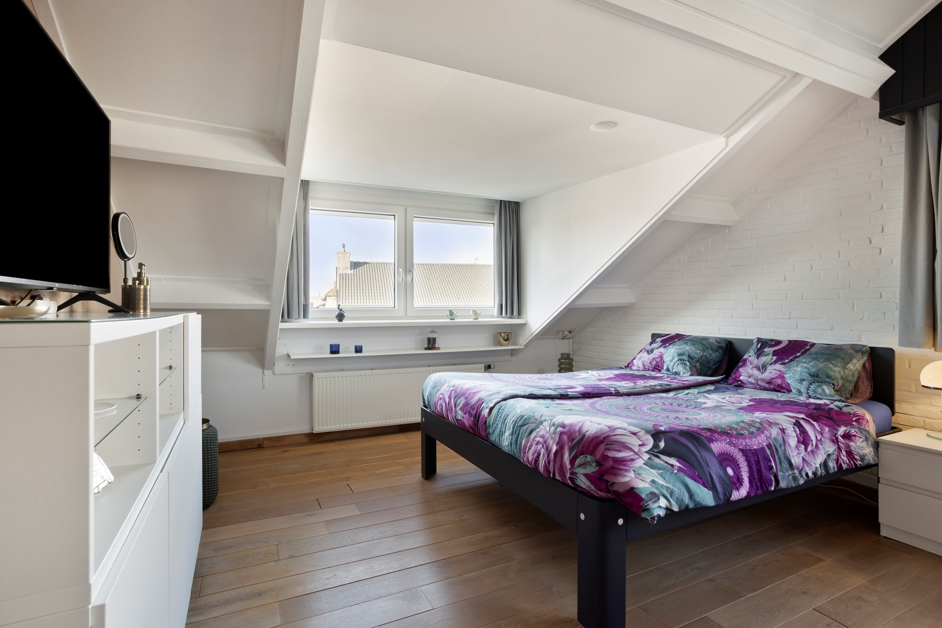 De grootste slaapkamer is een echte blikvanger, met verhoogde nok, sfeervolle donkere houten accentwand, royale inbouwkasten en een vide. Via een mooie houten trap is vanuit deze kamer directe toegang tot de zolderverdieping.