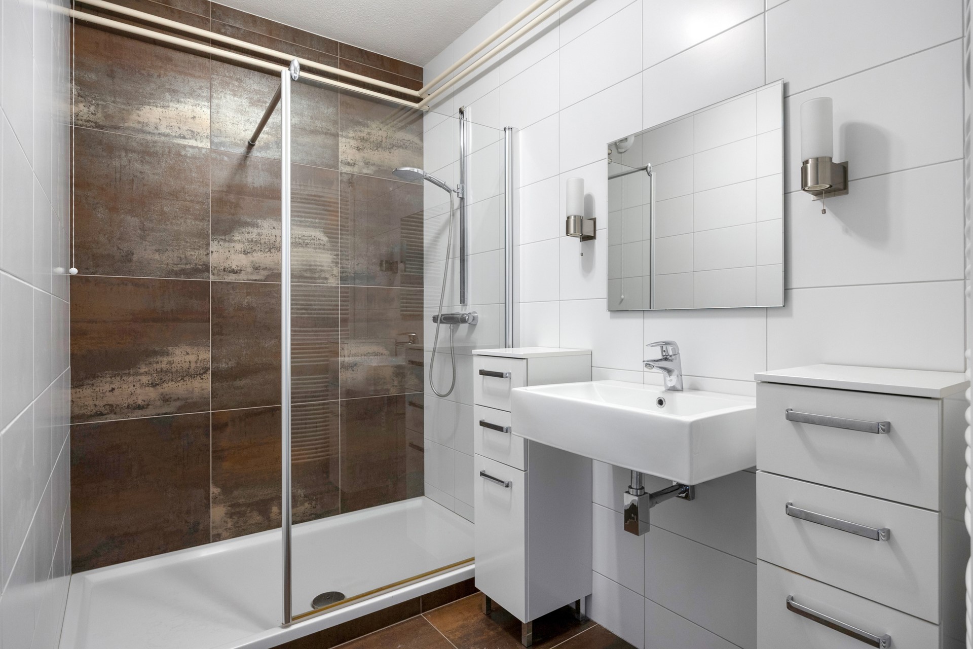 Badkamer en toilet zijn netjes afgewerkt, waarbij de badkamer beschikt over een douche en wastafelmeubel, het toilet is separaat uitgevoerd.